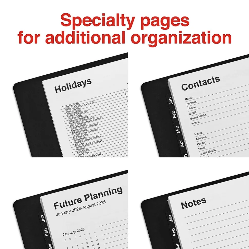 Plan your day in detail with this daily appointment book. The spiral twin-loop wire binding makes it easy to flip through the pages, while the black leatherette cover with a silver logo lends a professional look. This Staples 5 x 8-inch 2025 daily appointment book features appointment pages with 30-minute intervals so you can track important events.