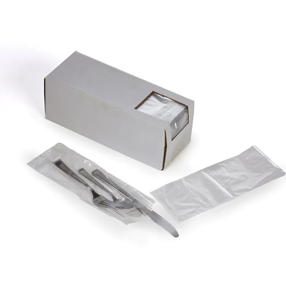 Our 0.6 mil Silverware bag in clear color in dispenser box features a fold-over flap that closes bag without tying or sealing for fast loading of silverware. 3.75″ x 10″ Bag is made of low-density polyethylene film, sold as 2000 per case.