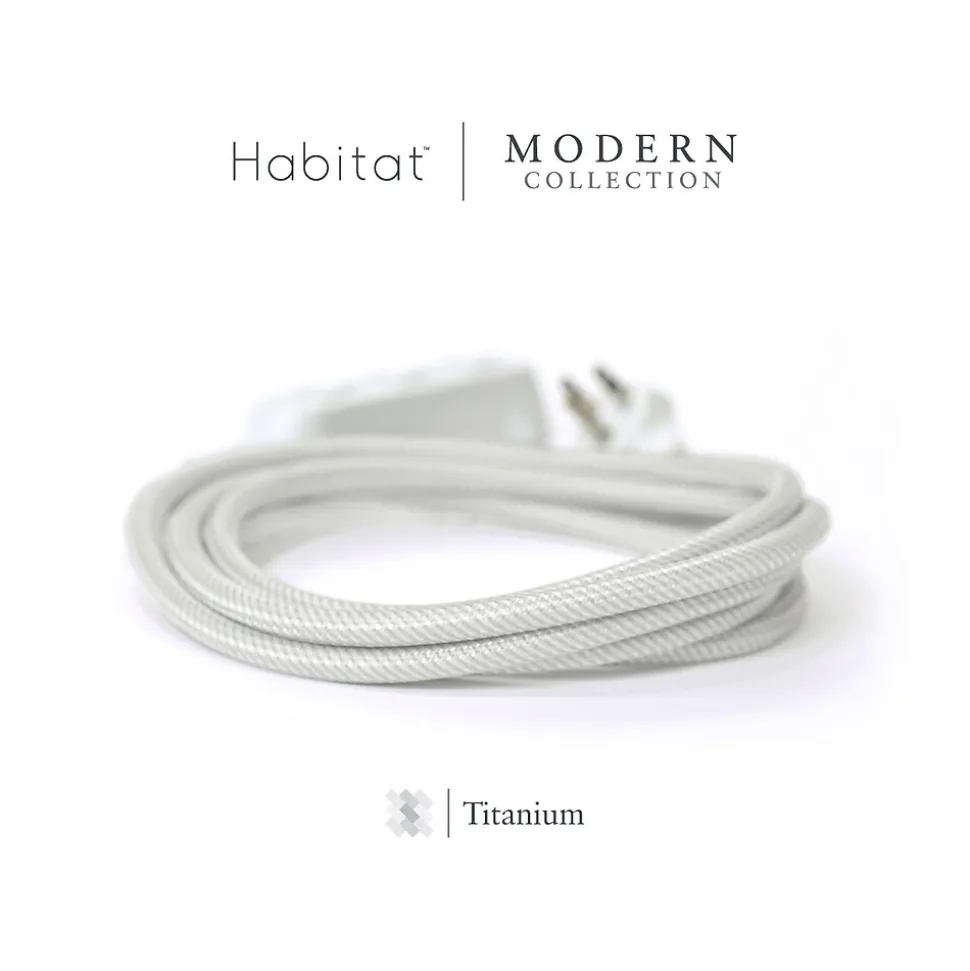 Plug in devices without leaving your desk using this extension cord. The 8′ length and right-angle plug access distant and hard-to-reach outlets, and the slim profile conserves space. This 360 Electrical Habitat Modern Collection 8′ braided extension cord has three AC outlets for multi-device connectivity.