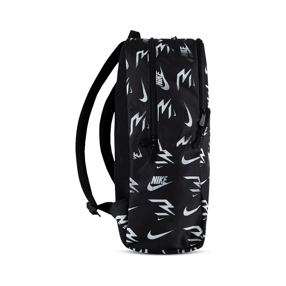 - Laptop backpack makes travel with electronics simple; made of durable polyester fabric and comes in black with an allover Nike logo pattern in white