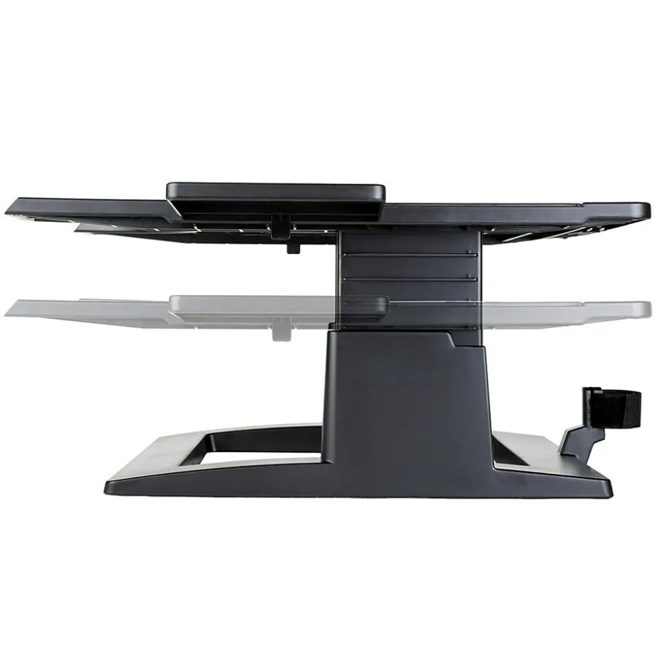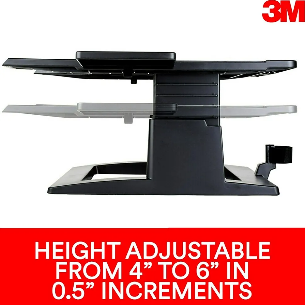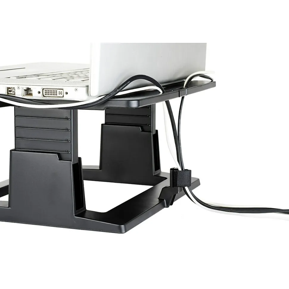Height adjustable from 4 in to 6 in in 0.5 in increments. Slots in platform help keep laptop ventilated.