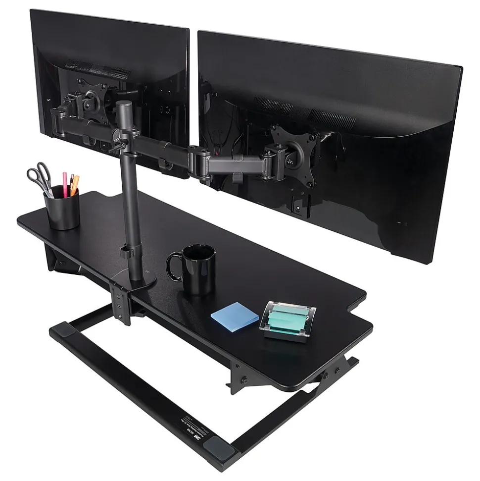 - Sturdy steel construction holds two monitors up to 28.5” W and 20 lbs. each, Black