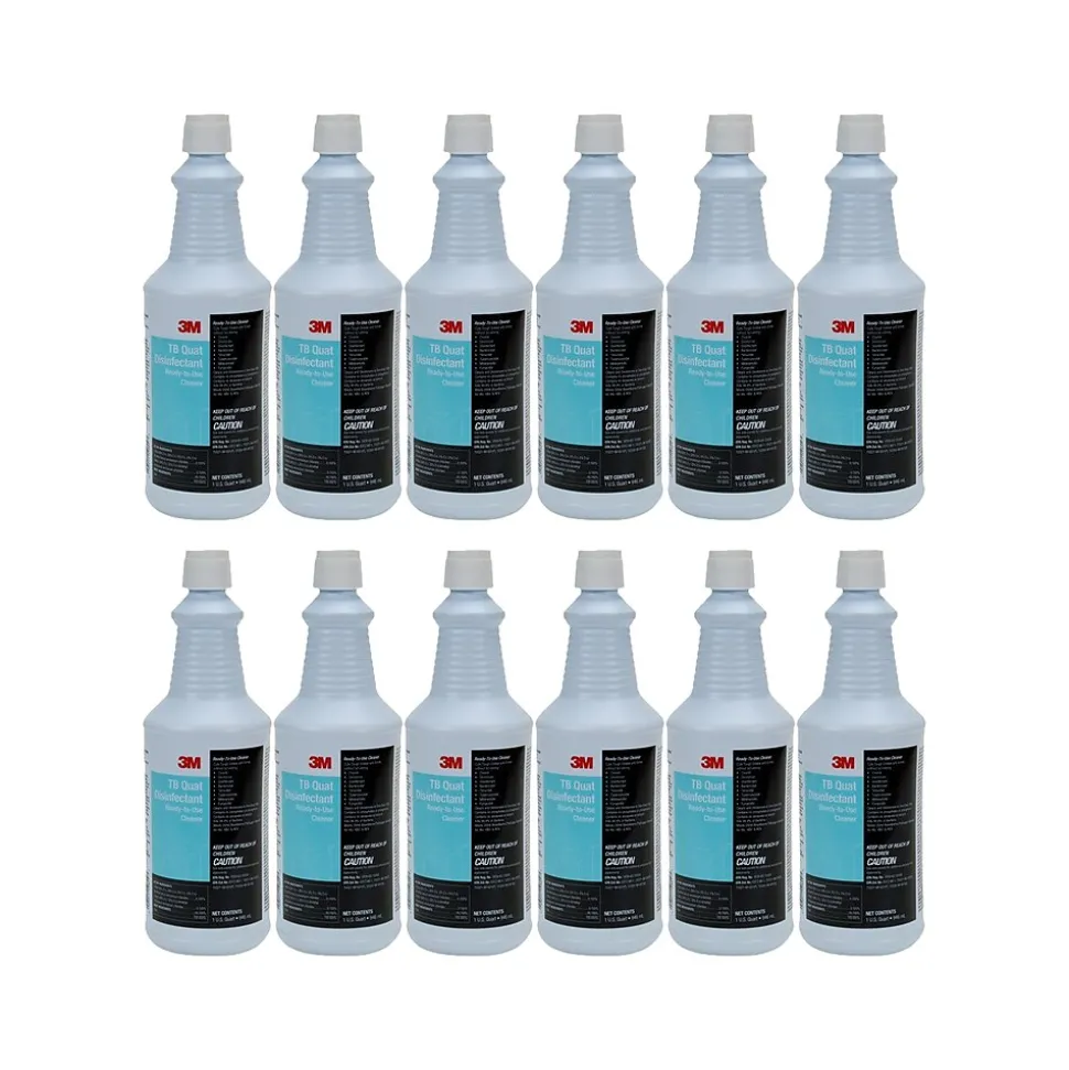 3M TB Quat ready-to-use, general-purpose, nonacid, nonabrasive cleaner and disinfectant provides excellent cleaning and deodorizing in one step. Rinse-free, EPA registered disinfectant formula disinfects and cleans hard, nonporous surfaces; hospital germicide for disinfecting and cleaning non-critical items. Provides broad-spectrum kill of gram-positive and gram-negative microorganisms, including TB, HBV, HIV-1, MRSA, VRE, and other pathogens. Meets or exceeds OSHA Bloodborne Pathogens standard for disinfecting surfaces soiled with blood or other potentially infectious body fluids. Features pleasant lemon fragrance.