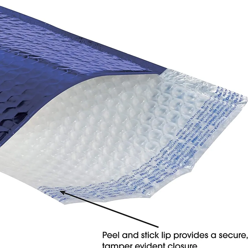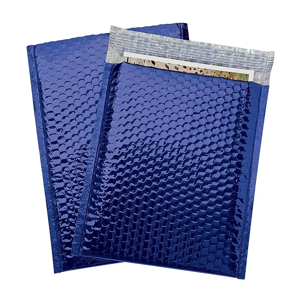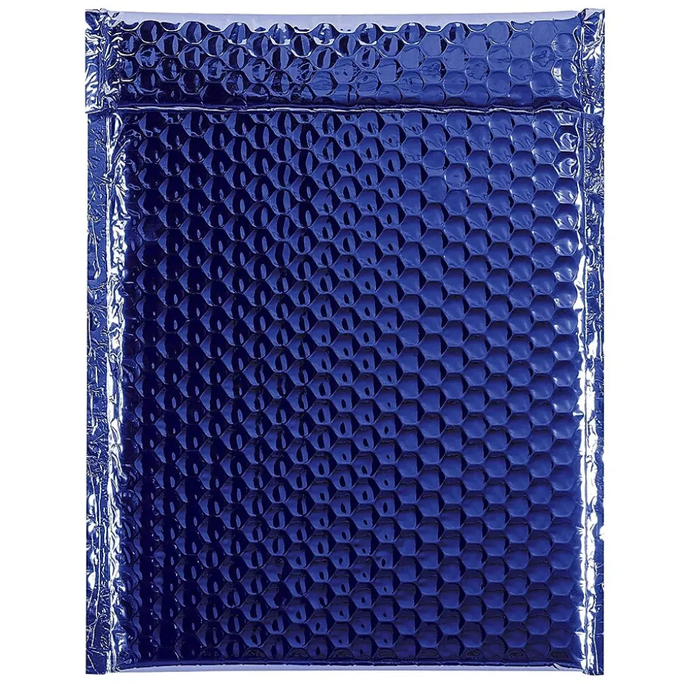 The 8″ x 10 7/8″ Glamour Bubble Mailer features a peel and seal adhesive closure as well as a shiny blue metallic exterior. Mailer is lightweight and offers moisture resistance.