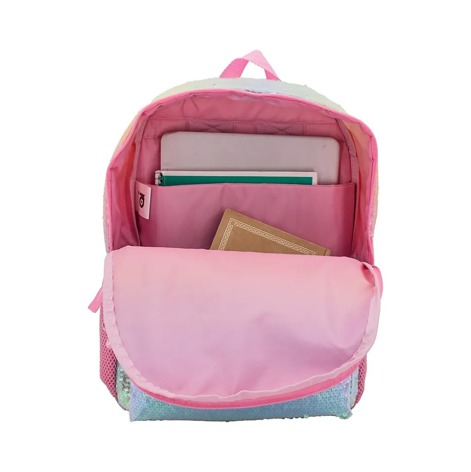 This adorable Accessory Innovations Rainbow backpack is perfect for going back to school and beyond. This supercute backpack is made of durable polyester in pink, with the front adorned with sequins creating an ombre rainbow design. Features a detachable 3D molded rubber star dangle with floating confetti.