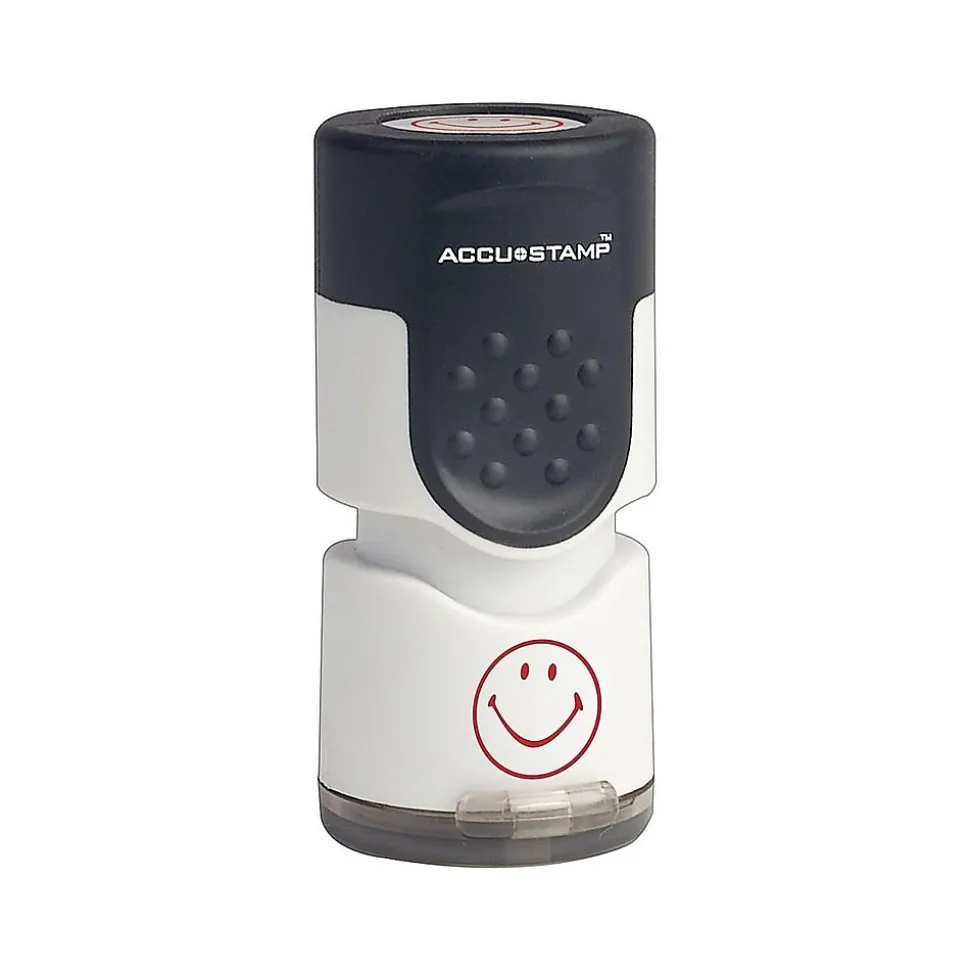 Liven up graded homework, memos, reports, and notes with this 0.6-inch stamp. This Accu-Stamp pre-inked smiley face stamp includes a protective plastic cap to keep the ink pad moist and ready for every impression.