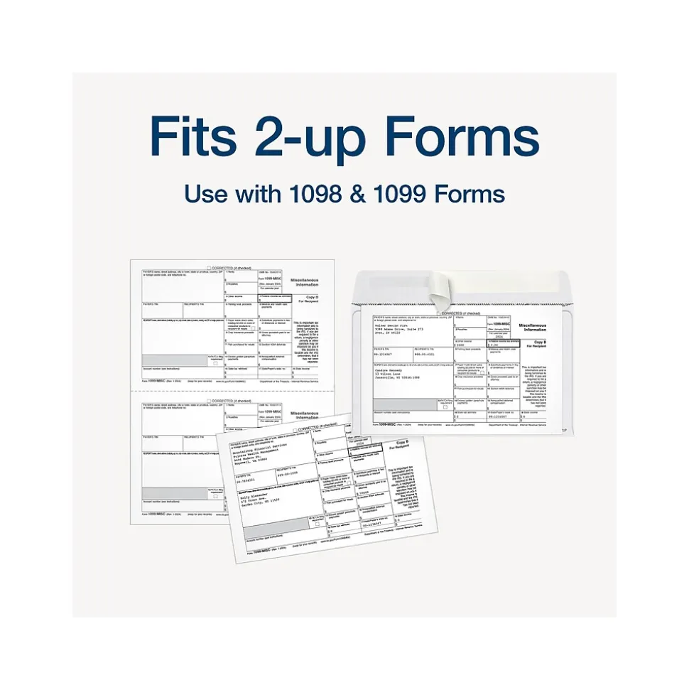 - Left aligned double windows fit your 2-up 1099 forms precisely without revealing your personal information.