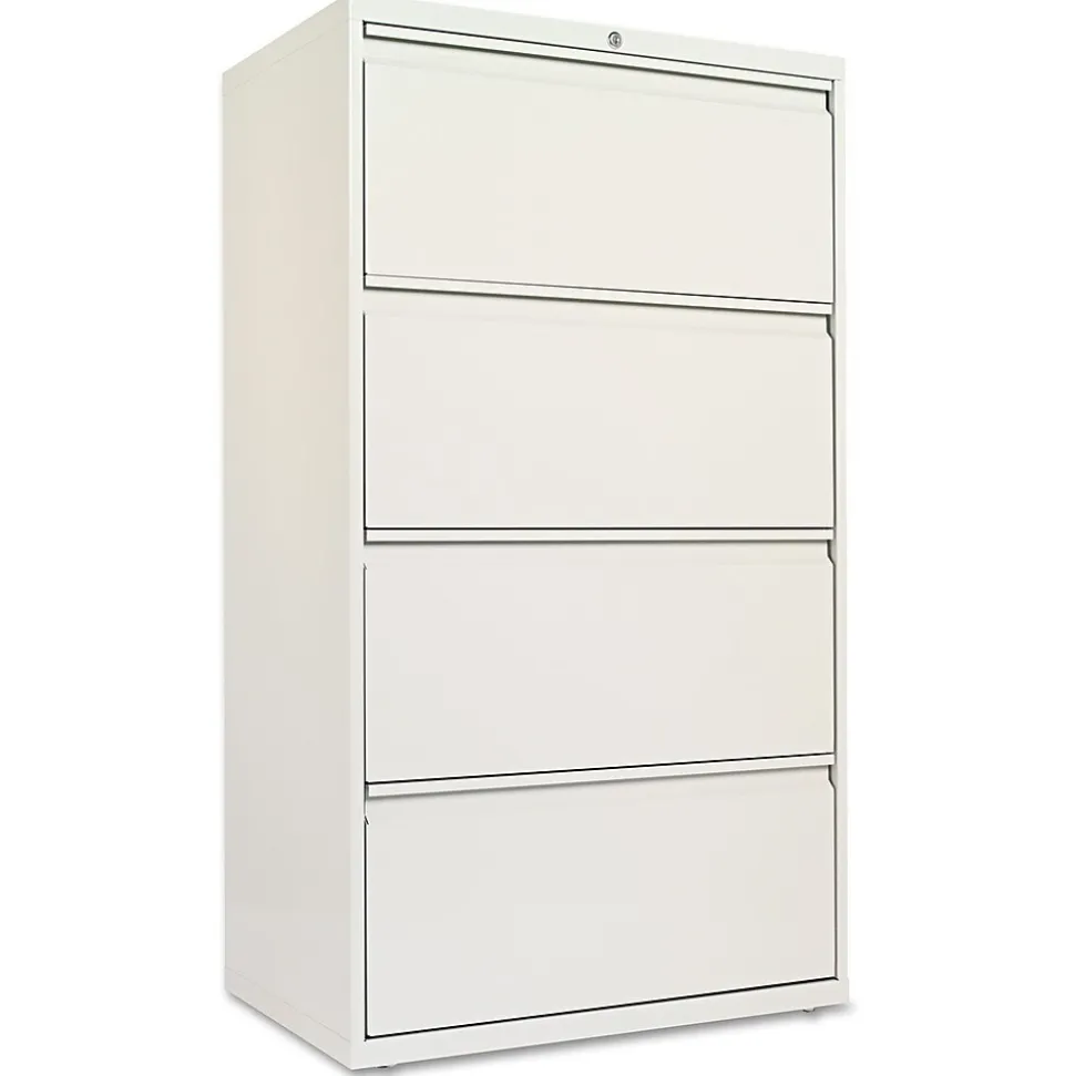 Alera® Four-drawer lateral file cabinet in light gray color features durable powder coated finish that helps to prevent scratches. Cabinet measuring 53 1/4″ x 30″ x 19 1/4″ comes with 4 adjustable leveling glides and single key core removable lock.