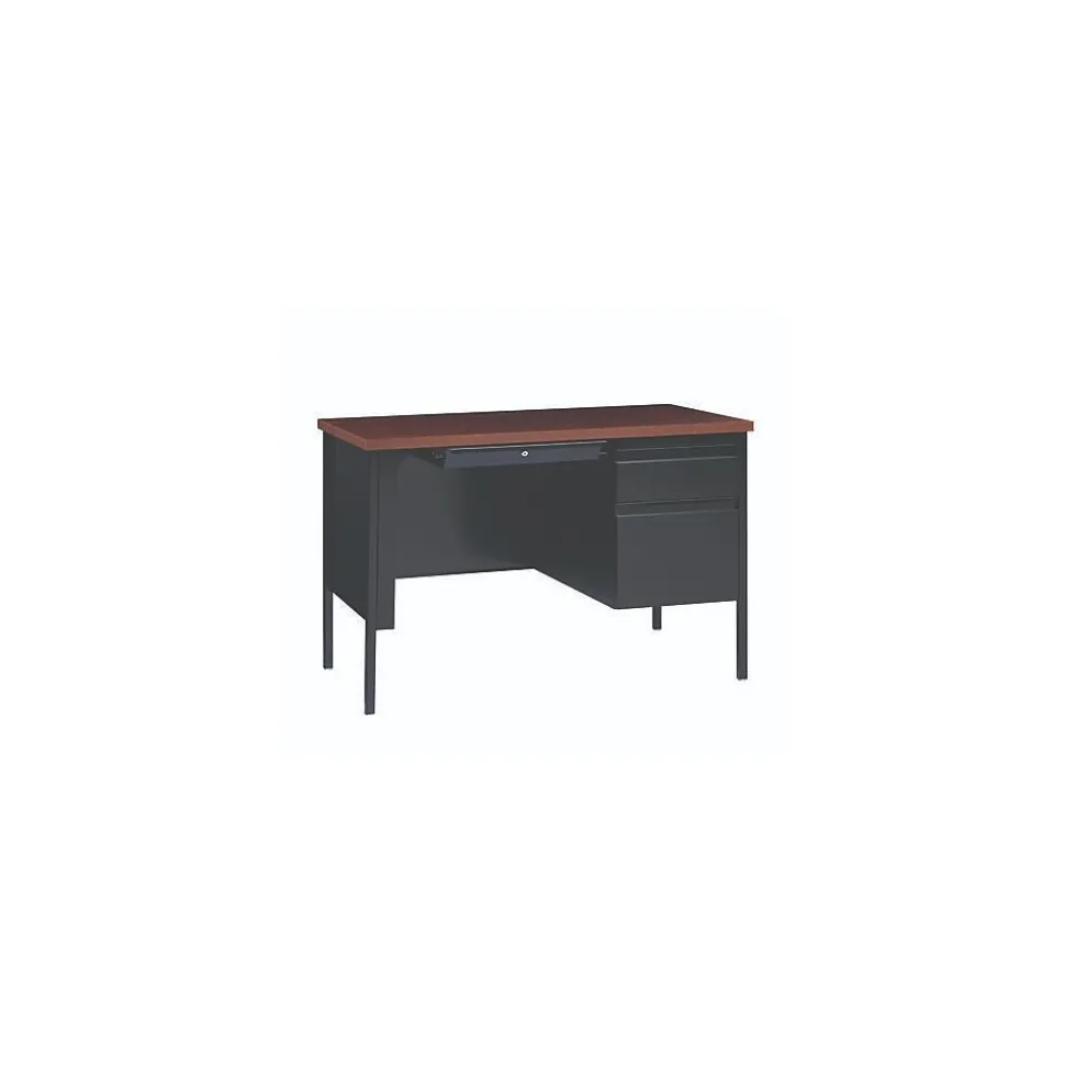 Built with a durable, powder-coated steel frame with 1″ square tubular steel legs. Standard features include full extension ball-bearing drawer slides for smooth drawer action, central locking center drawer, and a strong laminate wood top. Desks ship fully assembled except for the legs. All necessary hardware to attach the legs is included. Designed to meet or exceed ANSI-BIFMA industry standards for performance and workmanship.