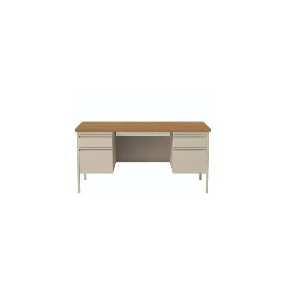 Built with a durable, powder-coated steel frame with 1″ square, tubular steel legs. Includes a full extension, locking file drawer with telescoping ball bearing slides to accommodate hanging file folders. Box drawer operates on steel roller suspensions. Center drawer lock secures all drawers. Aluminum drawer handles. Three-quarter height modesty panel provides privacy. Leveling glides adjust for uneven floors.