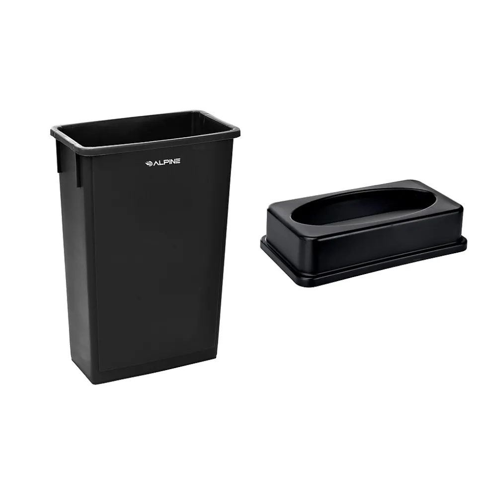 Alpine Industries 23 Gal. Waste Basket Commercial Trash Can is stylish and compact, making it easy to fit into any office or commercial space. This trash can features a large and clear print label, making it a noticeable trash disposal solution even from far away. It’s conveniently designed for function and can handle a beating. Designed with anti-jam reinforcements so you can easily throw trash away quickly and easily. Great waste basket for small to medium traffic areas in the home or office.Includes a lid, making it easy to fit into any office or commercial space. It’s conveniently designed for function and can handle a beating. The lid swings open for easy disposal of trash. Trash can lid fits snugly into place.