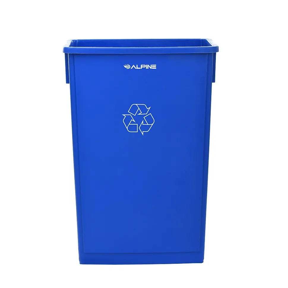 Alpine Industries 23 Gallon Blue Slim Recycle Bin stylish and compact, making it easy to fit into any office or commercial space. This gray trash can features a large and clear black print label, making it a noticeable trash disposal solution even from far away. The lid is designed to insert paper, envelopes and the like. Use to recycle or hide rubbish with this 1 slot lid. The trash can and lid are conveniently designed for function and can handle a beating.