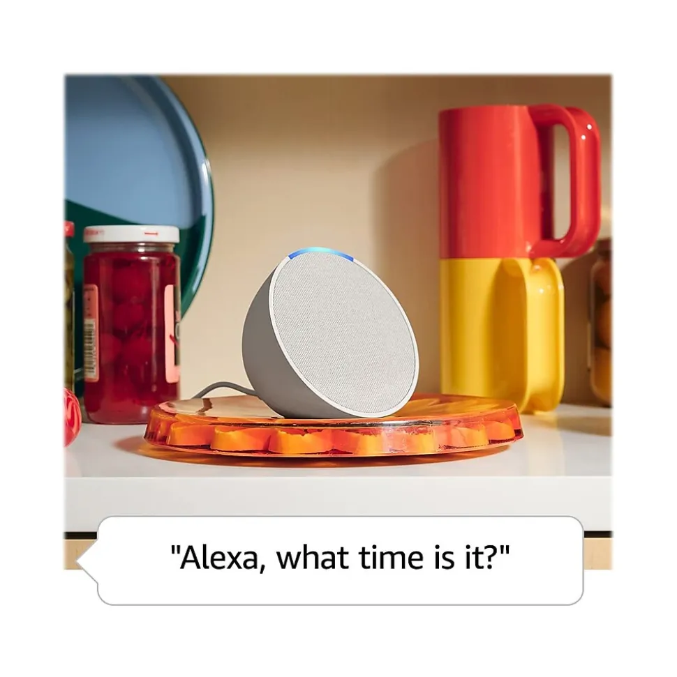 The Amazon Echo Pop compact smart speaker with Alexa features full sound that’s great for bedrooms and small spaces. Small enough to blend in and mighty enough to stand out. Control music with your voice, ask Alexa to play music, audiobooks, and podcasts from your favorite providers like Amazon Music, Apple Music, Spotify, Pandora, SiriusXM, and more. Connect via Bluetooth to stream throughout your space. Easily control compatible smart home devices like smart plugs or smart lights with your voice or the Alexa app. Have Alexa set timers, check the weather, read the news, reorder paper towels, make calls, answer questions, and more. With tens of thousands of skills and counting, Alexa can help you do more or do less, like playing relaxing sounds and testing your music knowledge. Alexa doesn’t begin listening until your device hears you say “Alexa” and the light bar turns blue. Make your room a vibe with the Echo Pop front-firing speaker that delivers full sound. Amazon is not in the business of selling your personal information to others, so the speaker is built with multiple layers of privacy controls, including a mic off button. The fabric is made of 100% postconsumer recycled yarn and aluminum is 80% recycled. Packaging is 100% recyclable.