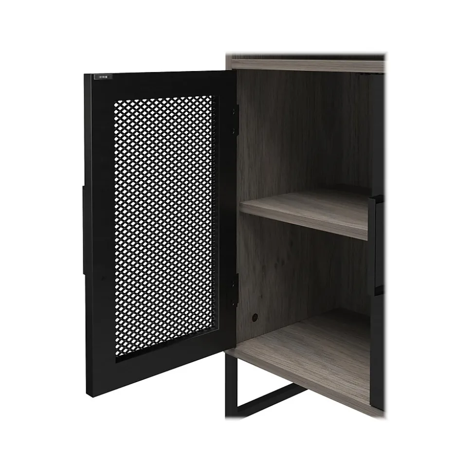 - Made of durable laminated MDF and particleboard in a gray oak finish with sturdy black powder-coated metal with stylish mesh front doors