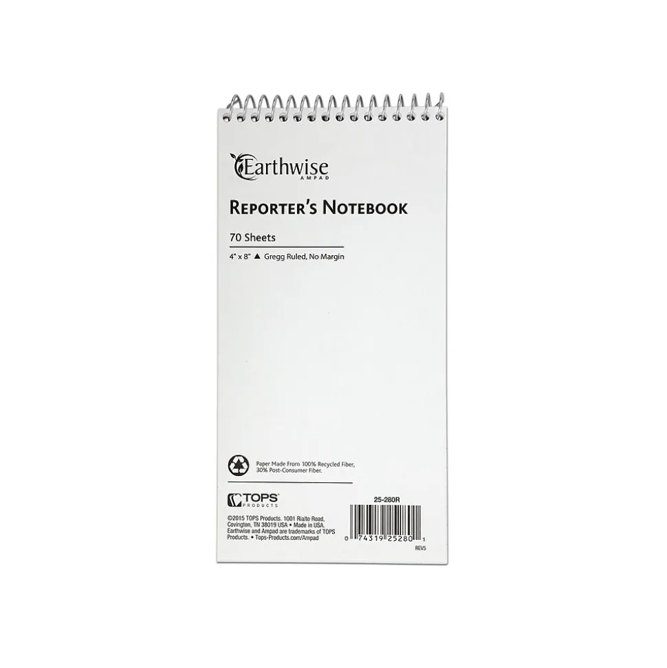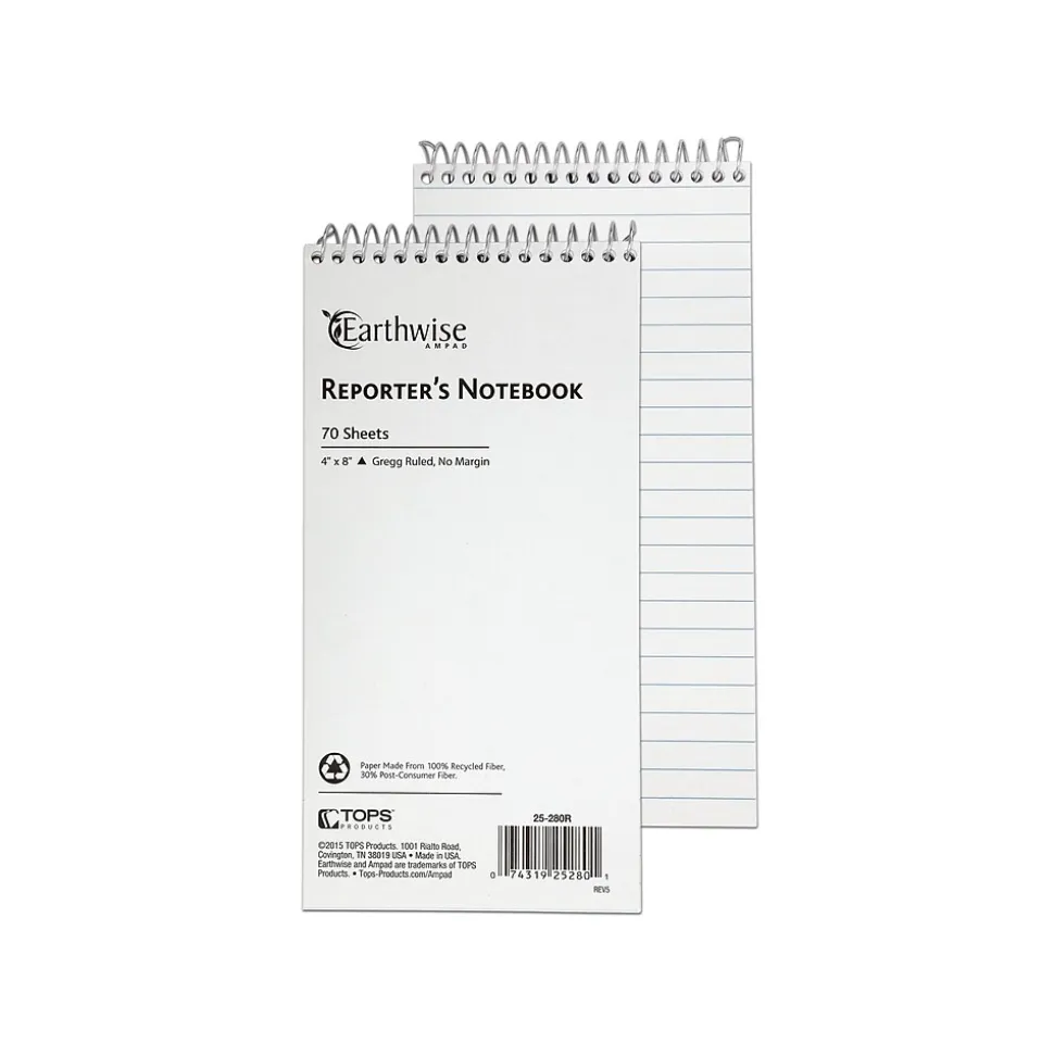 Take accurate notes for stories and reports with these Ampad Greencycle reporters notebooks. The Gregg-rule format lets you fit more information on every page, and the wire-bound tops make it easy to refer back to previous pages of notes. Each notebook features a compact size that rests perfectly in hand. With a sturdy recycled backing, these Ampad Greencycle reporters notebooks offer a durable writing surface.