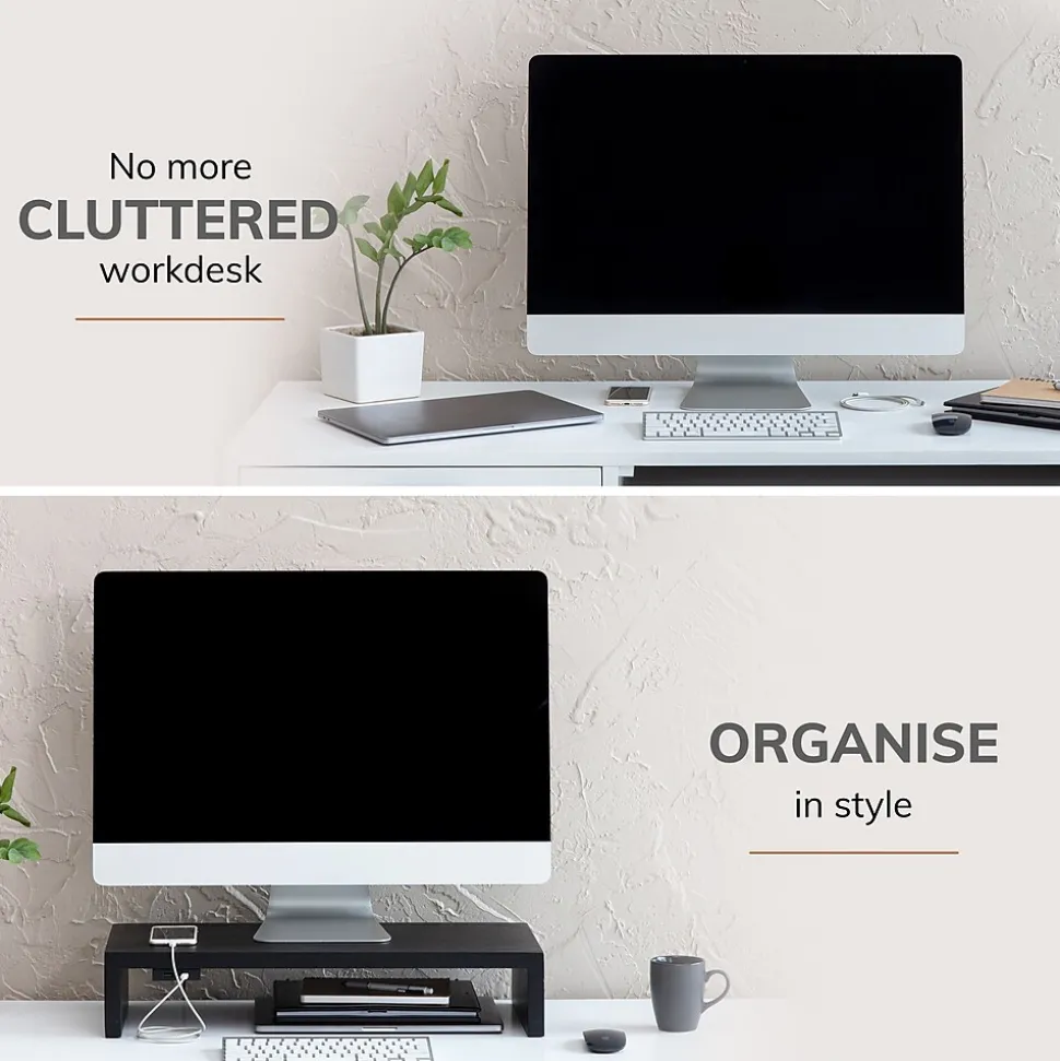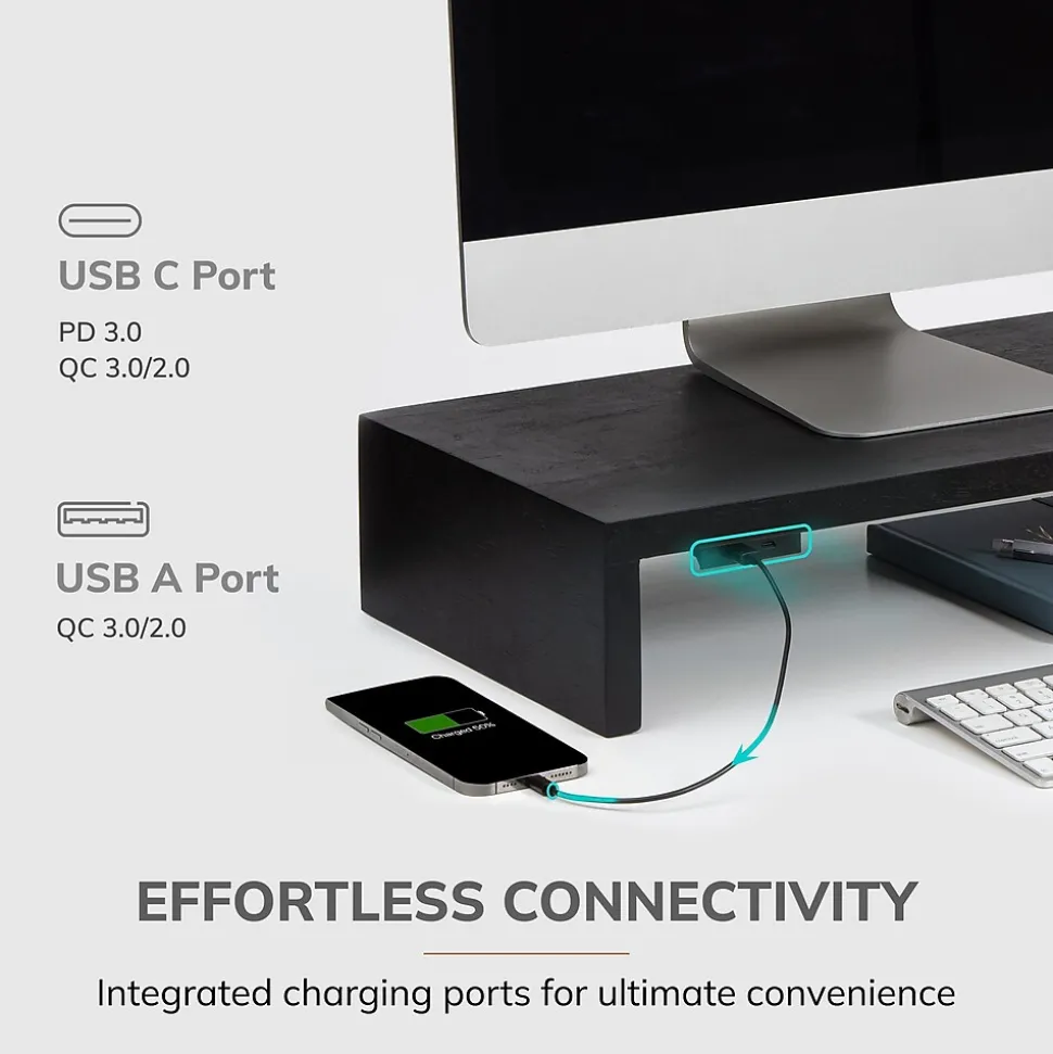 Tired of a cluttered and uncomfortable workspace? Anji Mountain’s modern Monitor Stands are the solution you’ve been searching for. Crafted from sustainable and solid mango wood with a rich black finish, these stands boast a minimalist design with integrated legs that complement any décor. Enhance your comfort and productivity by elevating your screen to an ergonomic height, reducing neck and eye strain. The anti-skid EVA foam foot pads ensure stability, while the finger joint construction guarantees durability. This model is power-equipped featuring two USB outlets (one Type A, one Type C) and supports up to 22 pounds, helping you create the perfect workspace for your needs.Upgrade your workspace today with the modern elegance and functionality of Anji Mountain’s Monitor Stands.