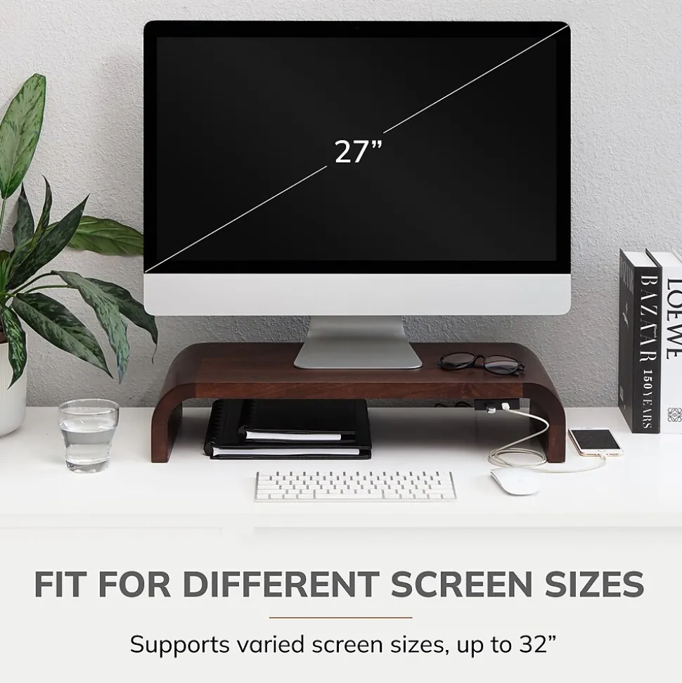 Experience the perfect blend of style, function, and ergonomics with Anji Mountain’s new collection of modern Monitor Stands. Crafted as a seamless, single piece from solid mango wood with a rich walnut finish, these stands feature gently curved legs that seamlessly integrate into the design, effortlessly complementing any workspace while providing a healthy viewing angle for your monitor. Designed to enhance your comfort and productivity, our monitor stands elevate your screen to an ergonomic height, reducing neck and eye strain. The anti-skid EVA foam foot pads ensure stability and protect your desk’s surface. Choose our power-equipped model with two USB outlets (one Type A, one Type C) for charging your devices. This option supports up to 22 pounds. Upgrade your workspace today and discover a more comfortable, productive, and stylish work experience with the modern elegance of Anji Mountain’s acacia wood Monitor Stands.