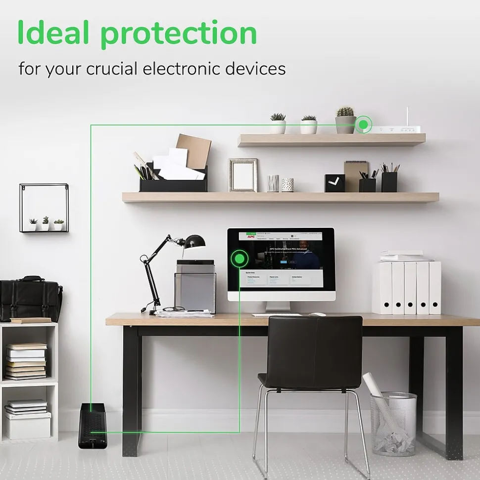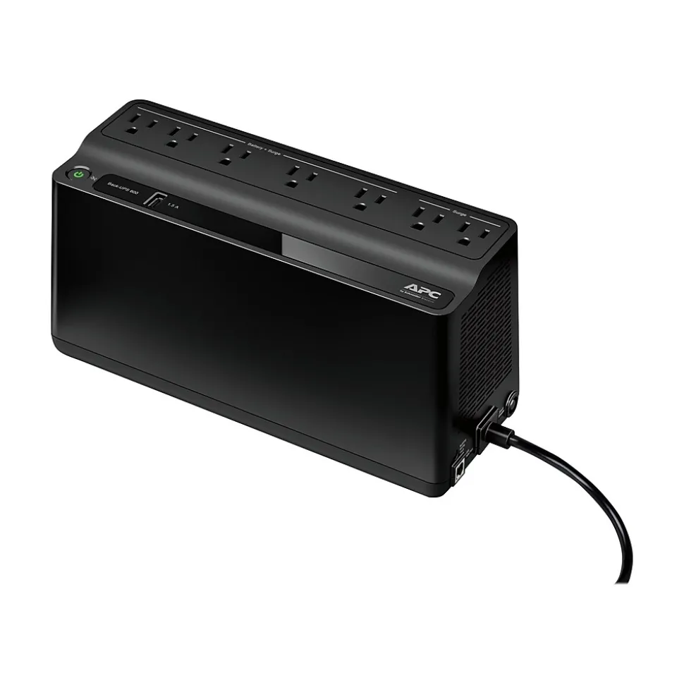Secure a workstation with this battery backup. Up to 12 minutes of run time on half load or 3 minutes on full load lets users save work or maintain critical connections during a power flicker. The built-in USB port lets you charge a mobile device. This 330-watt rechargeable APC Back-UPS backup battery’s surge protection buffers your devices from unnecessary voltage.
