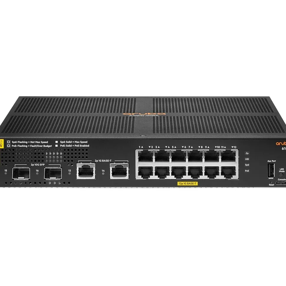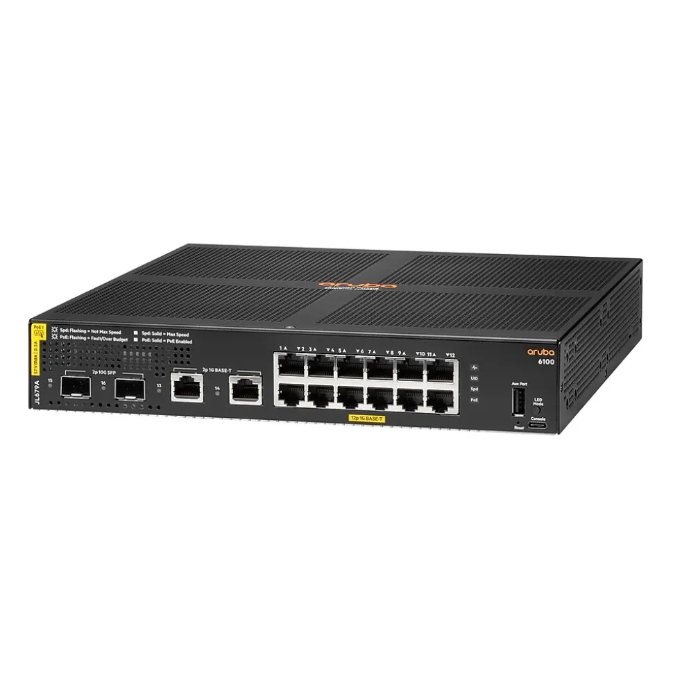 The Aruba CX 6100 Switch Series is a modern family of entry level access switches perfect for branch offices, mid-market enterprise, and SMB networks. Designed for reliable, simple, and secure access, the Aruba CX 6100 switches provide a convenient wired access solution for enterprise networks supporting IoT, mobile, and cloud applications. Prepare your network for tomorrow’s unpredictable demands with a powerful Aruba ASIC architecture and programmable AOS-CX operating system used across the Aruba CX portfolio to deliver a more consistent, more efficient operator experience. This layer 2 switch series has convenient built-in high speed uplinks with up to 139W of IEEE 802.3at Class 4 PoE to support IoT devices such as security cameras and wireless APs. A compact and fanless 12 port model is perfect for use in quiet work spaces. With robust QoS, support for static routing, and IPv6, the Aruba CX 6100 also simplifies ownership with no switch software licensing requirements.