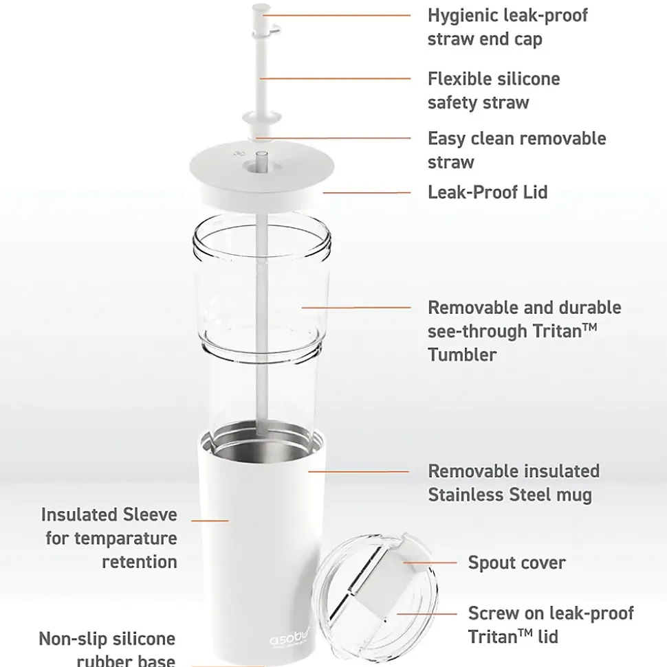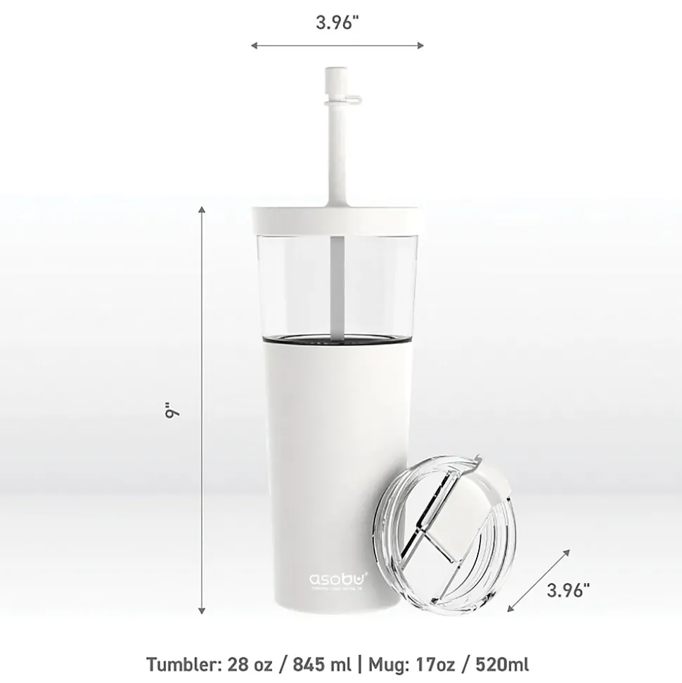 The White ASOBU Marina is the ideal travel companion — a durable, spill-proof straw tumbler with a detachable insulated coffee mug, for true 2-in-1 functionality. It features a slip-proof silicone rubber base, silicone straw with a spill-proof end cap, and an additional lid for hot drinks. Triple layer insulation helps retain heat and cold, so you can enjoy your drinks for hours. It’s all you need to get through a day at the office — or your next globe trotting adventure. Bon voyage!