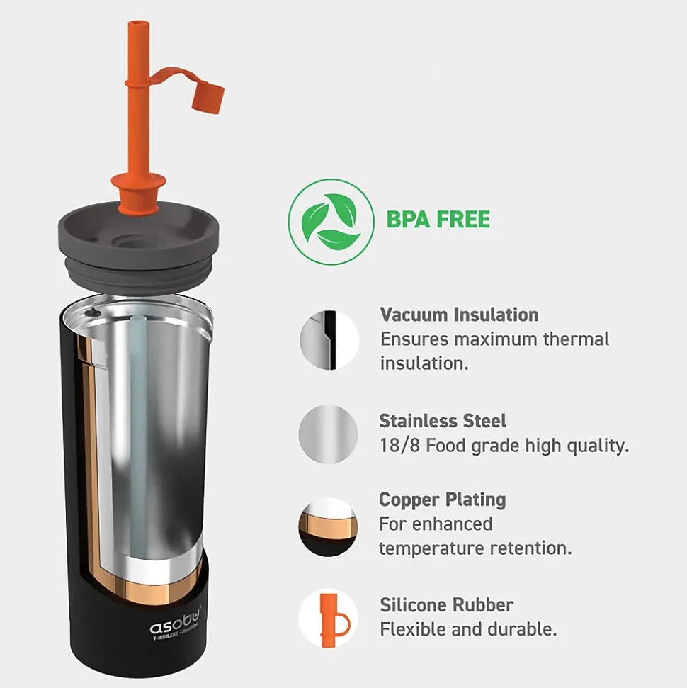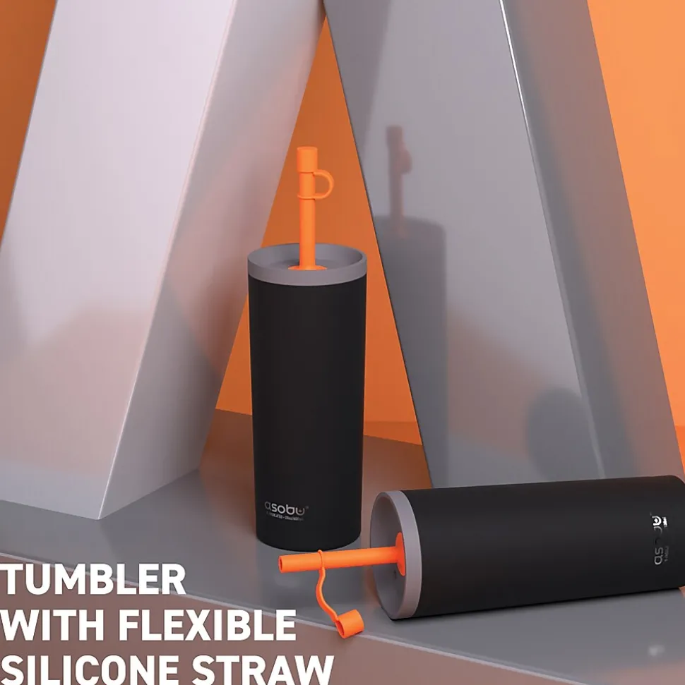 The Black ASOBU 20 Oz. Super Sippy Insulated Coffee Tumbler lives up to its name! The body is a double wall, insulated cup, which means your beverage stays cold or hot for hours. The 2-piece straw has a bendable silicone top on the outside, while the rest of the straw is made of Tritan to ensure it performs effectively day after day. The wide screw-off lid makes it easy to fill with liquid and ice cubes.