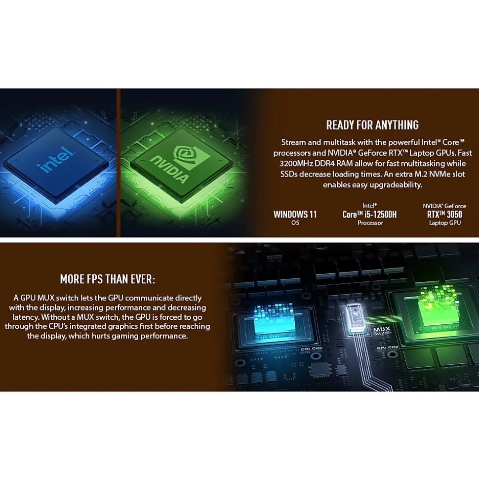 Jump right into the action with the Asus TUF Gaming F15 laptop. Stream and multitask with ease thanks to an Intel Core i5-12500H processor and 16GB of fast 3200MHz DDR4 RAM on Windows 11. Leverage the full gaming performance of the GeForce RTX 3050 laptop GPU with a dedicated MUX switch. When your game library gets full, an empty M.2 NVMe PCIe Gen 4×4 SSD slot makes upgrading storage capacity a breeze. Modern gaming laptops use powerful, dedicated graphics chips for high performance, but most route those frames through the CPU’s integrated graphics before reaching the display. This offers up to 9 hours of battery life, but prevents your GPU from giving its absolute best performance. The laptop provides an MUX switch for competitive games: you can switch to a direct GPU mode that reduces latency and boosts performance by an average of 5-10%.