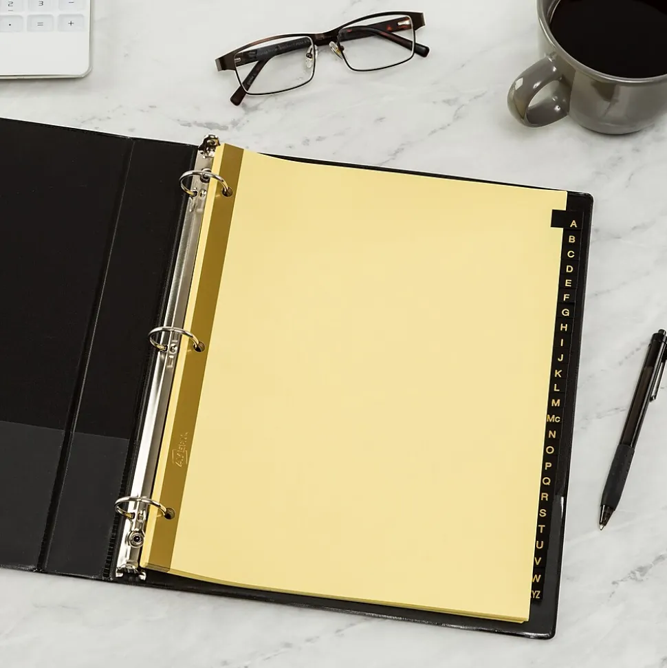 Avery pre-printed black leather-style tab dividers make it easy to find documents in your binders. The leather-like material on the tabs and tear-resistant buff stock handle regular use well, while the gold letters stand out on the black background and are placed on both sides the tab for even better visibility. Three holes make these dividers easy to place in standard three-ring binders of all sizes, and the tough design lets you reuse them for future projects.