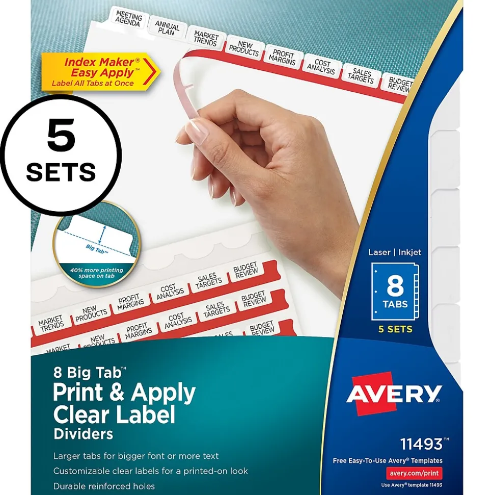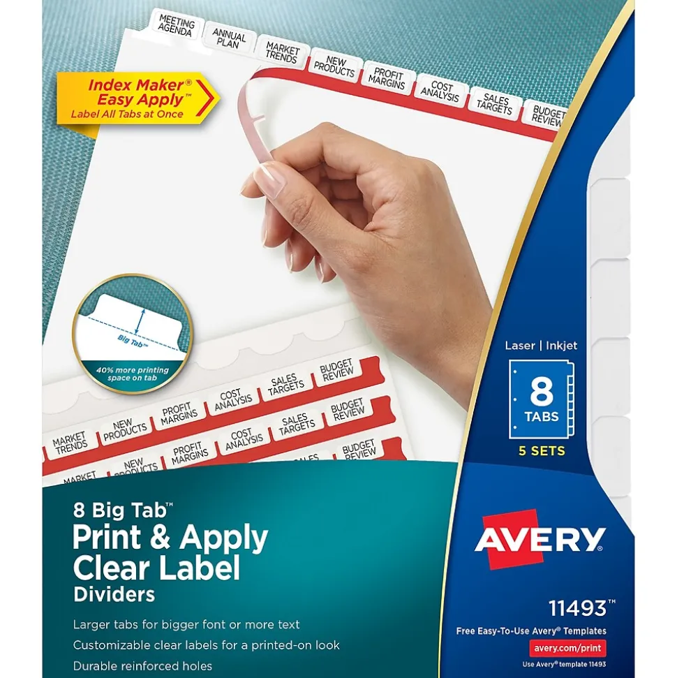 Don’t waste time and money ordering custom printed binder dividers with tabs when you can easily create and print your own personalized dividers with Avery Index Maker Clear Label Big Tab Dividers. Our larger Big Tab design offers more room for bigger fonts, more text and even logos or images. Customize your title tabs quickly and easily using the free templates on the Avery website and print with your inkjet or laser printer for clean, professional looking results in minutes. This pack comes with 5 sets of 8-tab dividers, and the Easy Apply clear label strips make it simple to apply all 8 labels of each set at once. Just print, align labels against tabs, smooth down labels and peel up strip. Each 3-hole punched durable divider also features doubled-sided, reinforced tabs and edges to help resist tearing for long-lasting, everyday use. These 3 ring binder dividers with tabs are a great addition to your medical office supplies, school binders, personal organizers, tax office supplies, presentation reports and more. Print, peel, and press your way to a perfect, precise project.