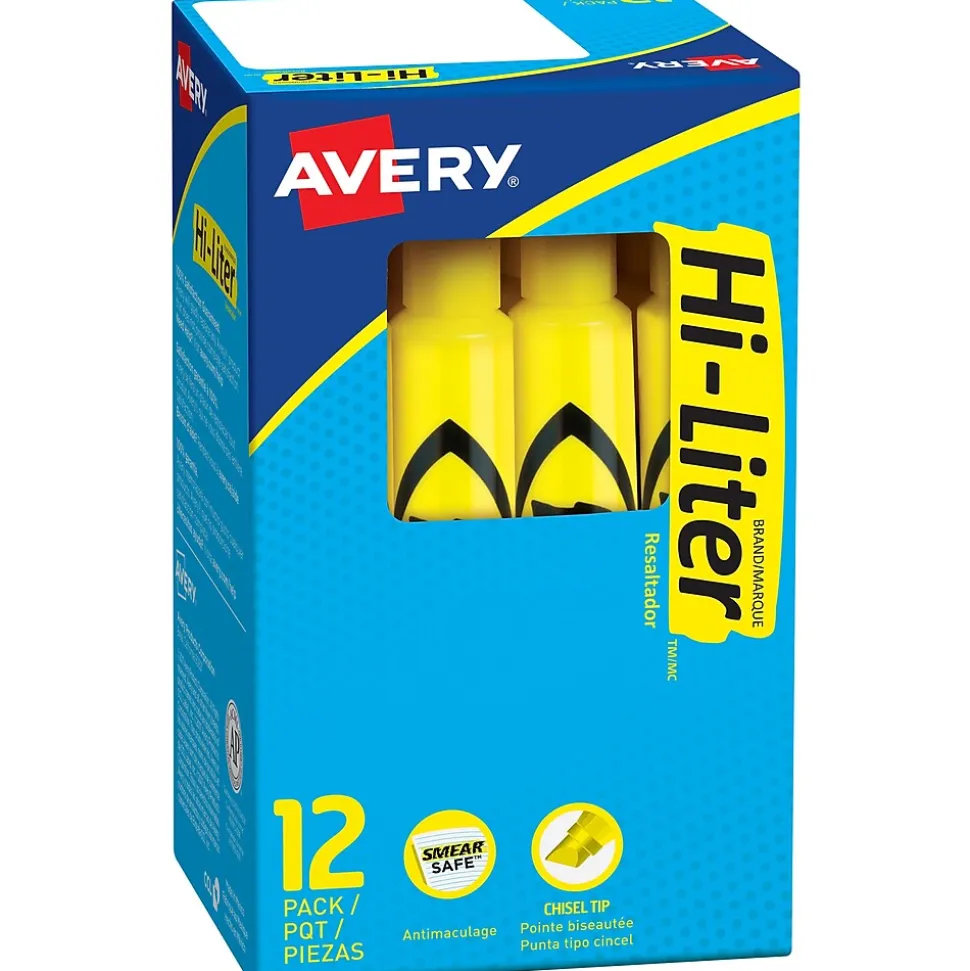 Draw attention to thoughts, ideas, and notes with these desk-style highlighters. Each one has a chisel-tip design that lets you boldly mark, finely underline or circle key points. These Avery Hi-Liter yellow chisel-tip desk-style highlighters use non-toxic ink for safety.