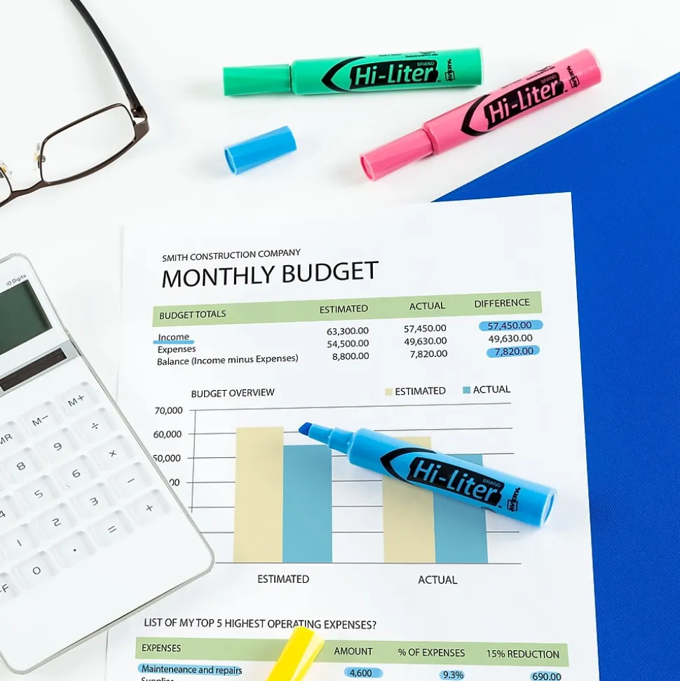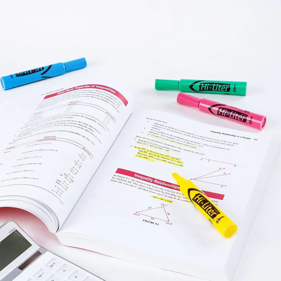 Call out bright ideas with this Hi-Liter set that lets you mark key words and phrases with brilliant, nontoxic colors. The molded chisel tip lets you highlight or underline, and the plastic tip won’t fray or mush. A faceted barrel provides a comfortable grip, so you can easily use the highlighter as you mark documents, notes, books and more. The improved formula means you can leave the cap off for up to a week and still highlight with ease. Trust the original.