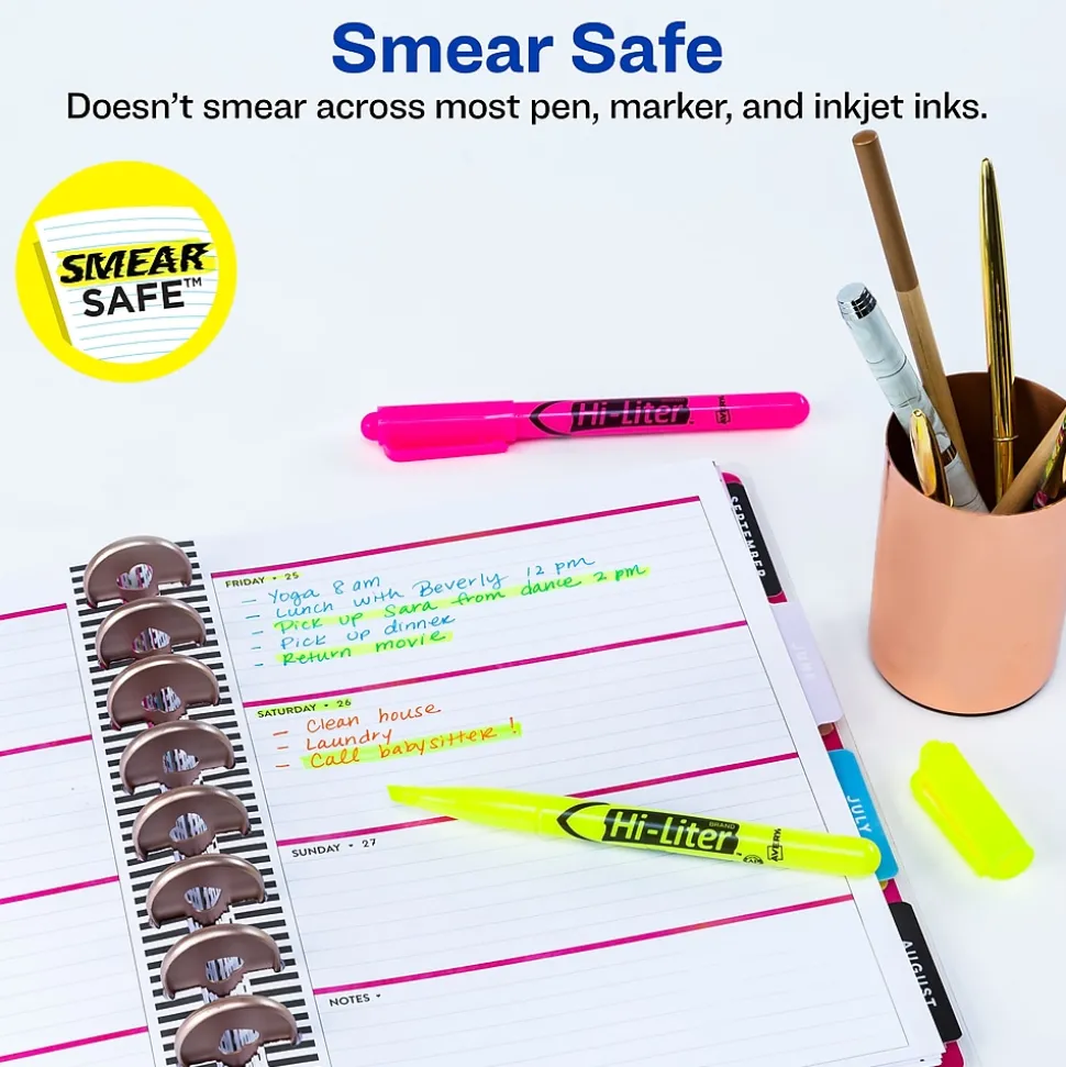 Keep track of important ideas and concepts with these fluorescent highlighters. The chisel tips make it easy to create fine lines or broad strokes, while the pink and yellow hues let you color-code information. These Avery Hi-Liter pen-style highlighters feature slim round barrels for a comfortable grip.