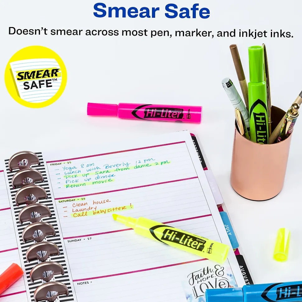 Draw attention to key words and phrases with these assorted-color nontoxic highlighters. With a chisel tip, these HI-LITER desk-style highlighters make it easy to create precise strokes, while the smear-resistant ink formula provides crisp, clear strokes.