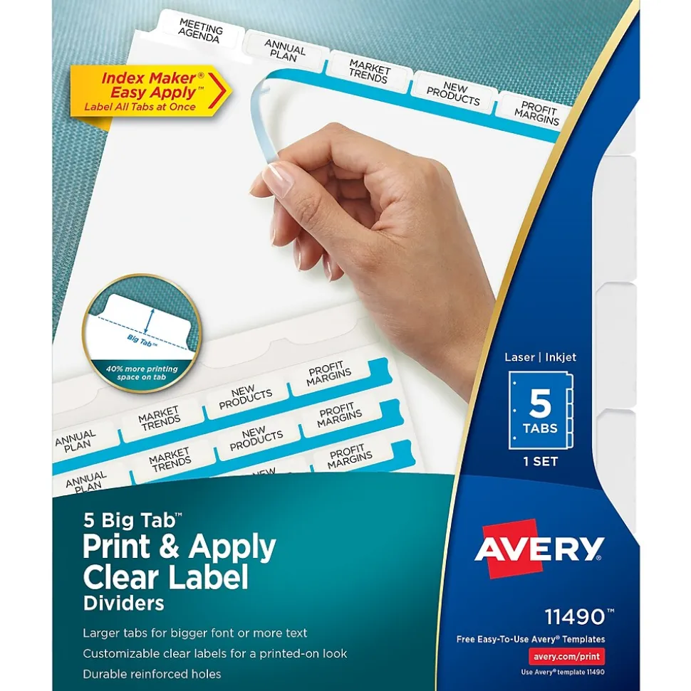 Don’t waste time and money ordering custom printed binder dividers with tabs when you can easily create and print your own personalized dividers with Avery Index Maker Clear Label Big Tab Dividers. Our larger Big Tab design offers more room for bigger fonts, more text and even logos or images. Customize your title tabs quickly and easily using the free templates on the Avery website and print with your inkjet or laser printer for clean, professional looking results in minutes. This pack comes with one set of 5-tab dividers, and the Easy Apply clear label strips make it simple to apply all 5 labels at once. Just print, align labels against tabs, smooth down labels and peel up strip. Each 3-hole punched durable divider also features doubled-sided, reinforced tabs and edges to help resist tearing for long-lasting, everyday use. These 3 ring binder dividers with tabs are a great addition to your medical office supplies, school binders, personal organizers, tax office supplies, presentation reports and more. Print, peel, and press your way to a perfect, precise project.