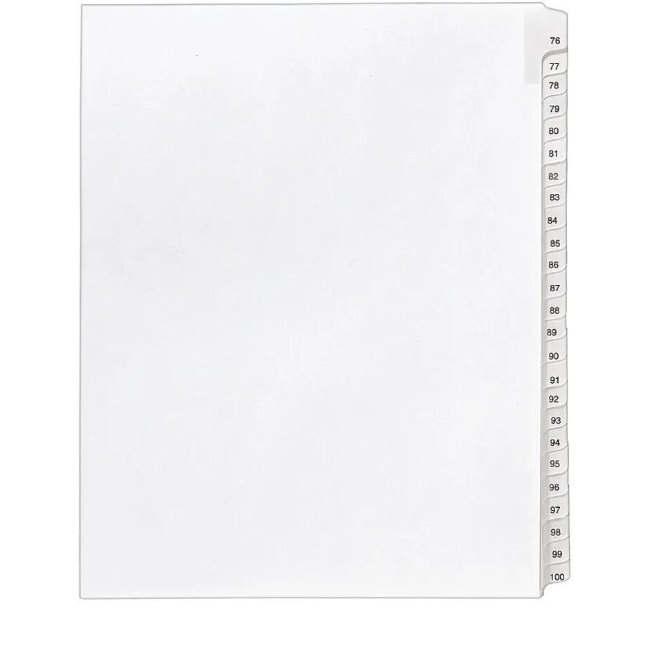 When you want disorganized files and unruly paperwork to cease and desist, turn to these Avery(R) Collated Legal Dividers – Allstate(R) Style featuring Tabs 76-100. Now you can bring order to index briefs, legal exhibits, mortgage documentation files, and more. Clear and durable Rip Proof(TM) reinforced tabs on white paper stock help you reference your documents with ease, and are conveniently preprinted on both sides using Helvetica regular type so you can find what you need in a flash. The binding edge is unpunched so they can fit practically any binding system, giving your files a clean and professional appearance. Your motion for clean and orderly files has been granted.