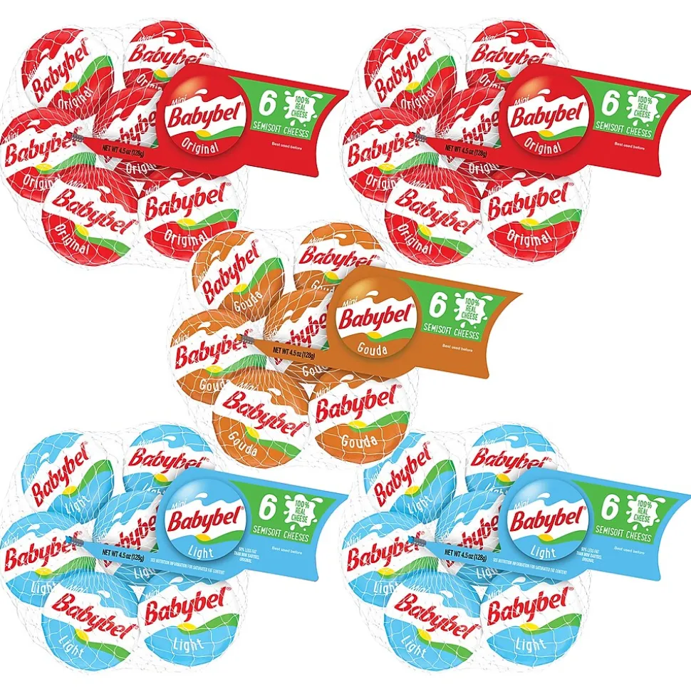 - 5 bags of Mini Babybel Variety Cheese with 6 pieces in each bag for a total of 30 mini cheeses.