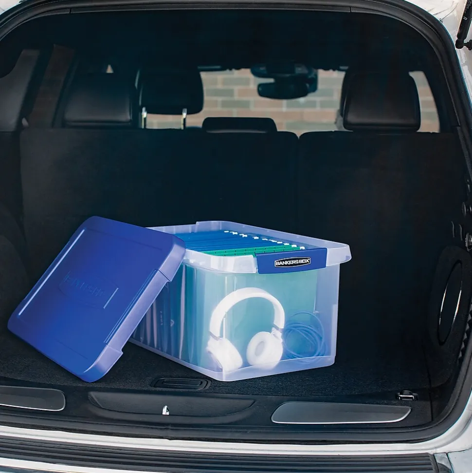The Bankers Box plastic storage container with lid provides organized and secure storage and transport of 20″ of letter files. Durable plastic storage bin construction with reinforced corners for added strength. Modular design offers easy stackability while built-in hanging rails keep legal-size files organized and accessible. Features comfortable handles for easy lifting and locking lid for secure transport.
