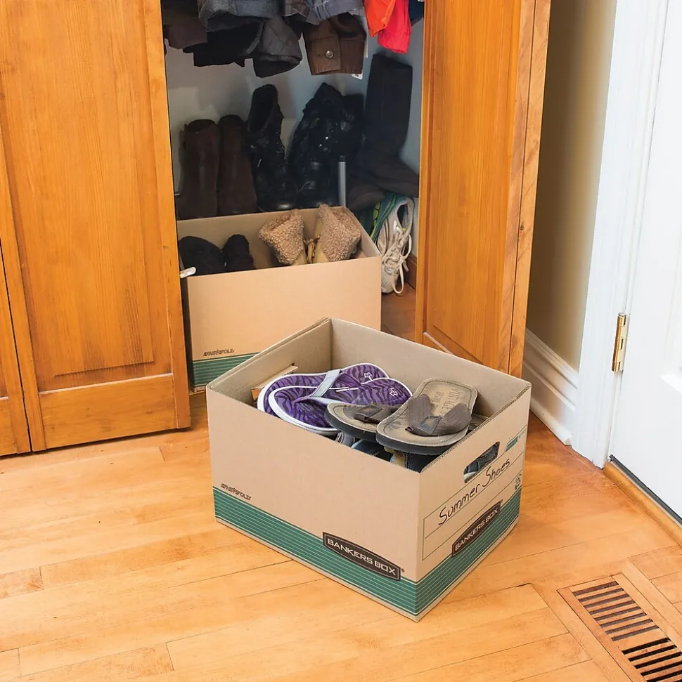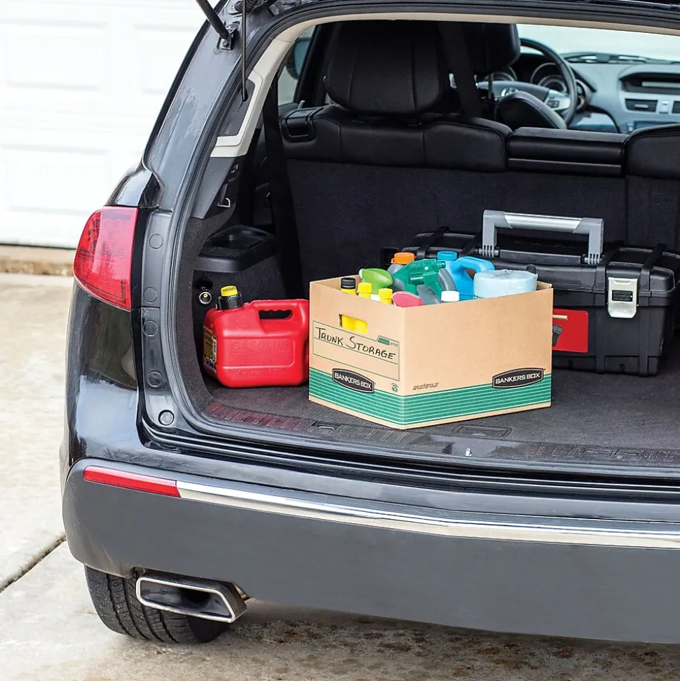 Archive file folders with these legal/letter storage boxes. The locking lift-off lids shield documents from dirt and debris, while the FastFold design makes assembly quick and easy. Cutout handles offer a secure grip when moving these file boxes, so you can easily transport them to your file room or storage unit. With durable construction, these Bankers Box Recycled FastFold Stor/File boxes offer added strength and resilience.