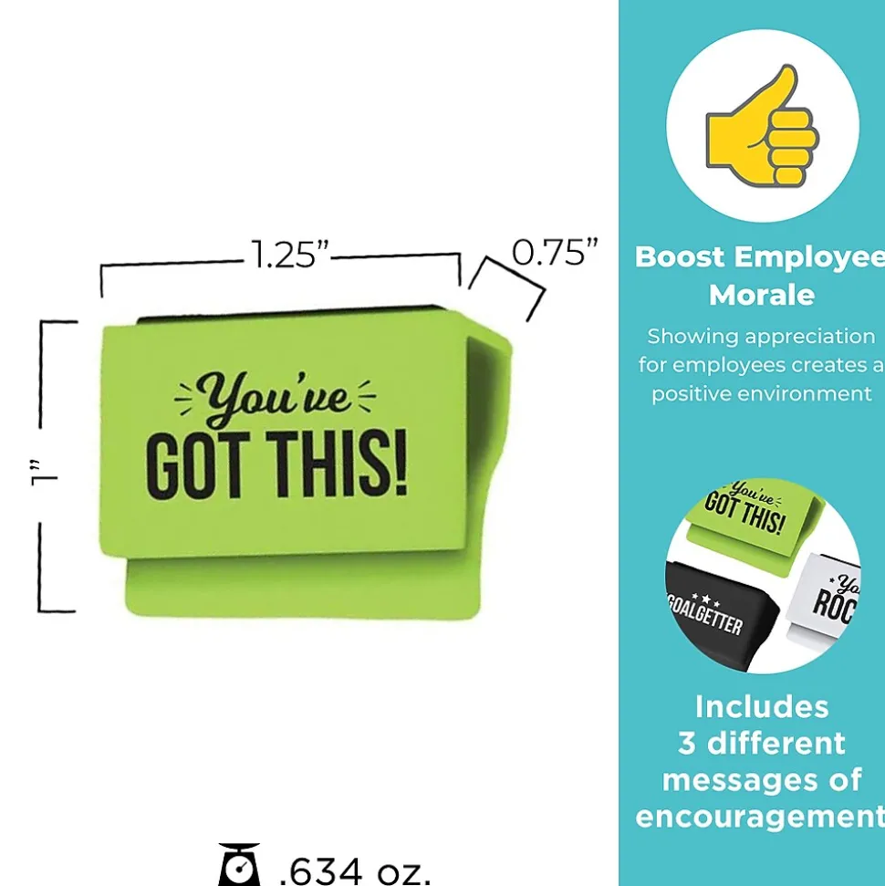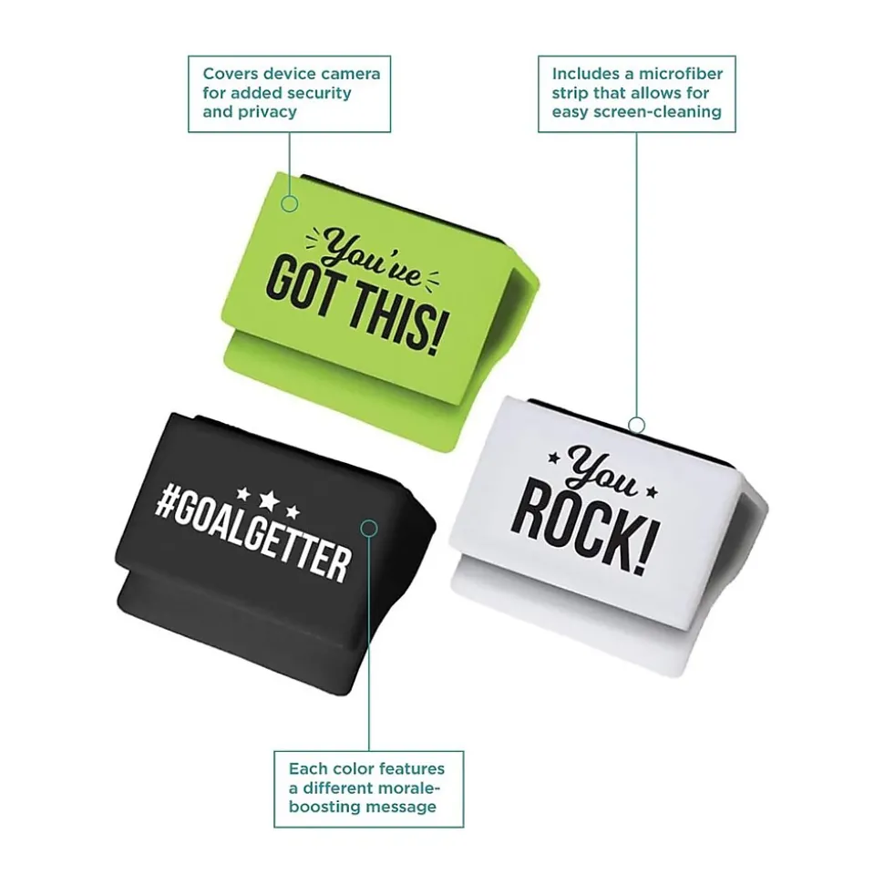 Each plastic web cam cover comes in a different color with its own sentiment and fits most laptops, tablets, or smartphones. Each pack includes 3 covers. Give to employees just because or for day-to-day recognition moments.