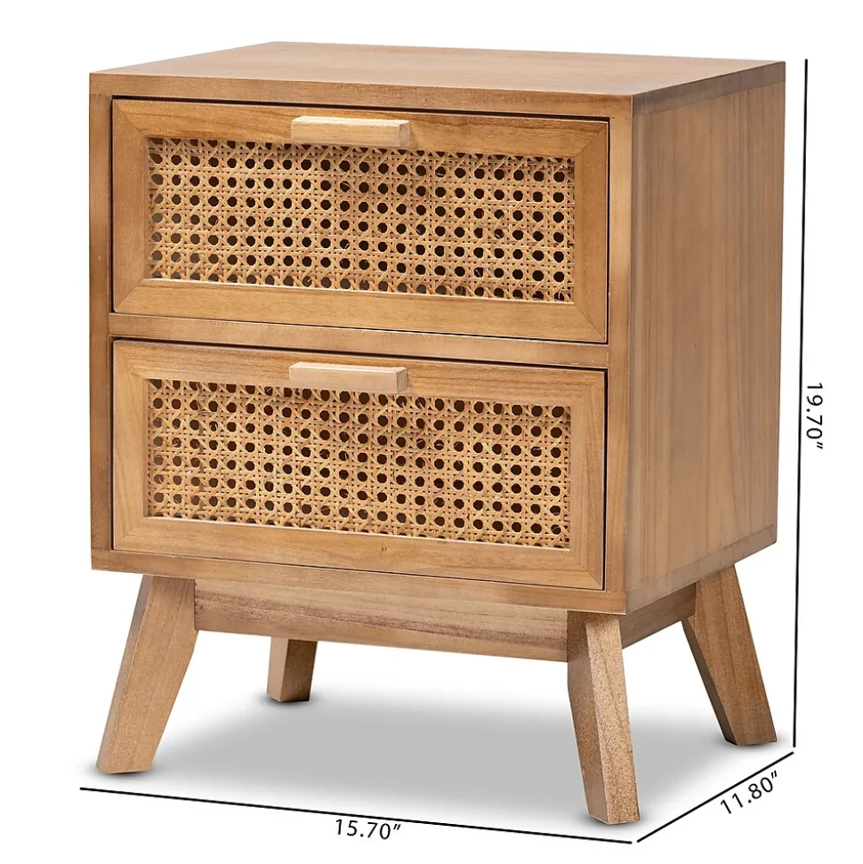 The stunning, retro-inspired design of the Baden nightstand elevates the capabilities of your nighttime routine. Made in China, this remarkable piece is crafted from sturdy wood and adorned with woven rattan drawer faces. Two drawers provide ample storage space for your nightly needs and reserve the tabletop for daily use. Requiring assembly, the Baden utilizes sleek, angled legs for stable support that lends classic charm. A fantastic solution for lively homes, the Baden nightstand develops the modern bedroom.This is a product of nature and may have variations in areas such as, but not limited to, color, pattern, grain and texture. The hair-like strands of rattan/rattan-fiber are common due to nature of the material.