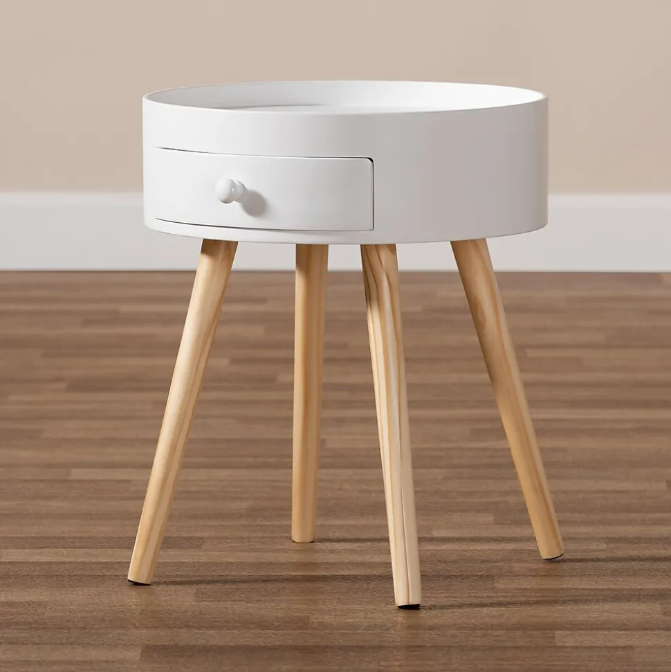 Add cool, quirky style to your bedroom with the Jessen nightstand. The Jessen features a tray-style top, ideal for keeping phones and other items secure. One drawer, fitted with a round knob, provides space to store bedside essentials. Functional and stylish, the Jessen showcases a sleek neutral finish that is complimentary to a wide range of color palettes. Angled wood legs add a stylish mid-century feel. The Jessen nightstand is made in China and requires assembly.