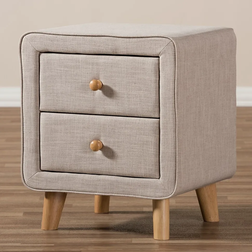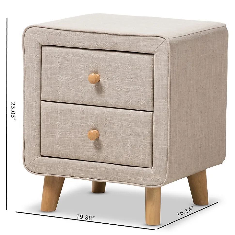 Featuring an upholstered frame and abundant storage, the Baxton Studio Jonesy 23″ High Nightstand is a unique and functional addition to the bedroom. The Jonesy is constructed from solid rubberwood and upholstered in beige polyester fabric. Two drawers provide storage for books, lotion, and other bedside necessities. Natural oak knobs on the drawers grant easy access. Inspired by mid-century modern design, the chest showcases light wooden splayed legs. The Jonesy nightstand is made in Malaysia and requires assembly.