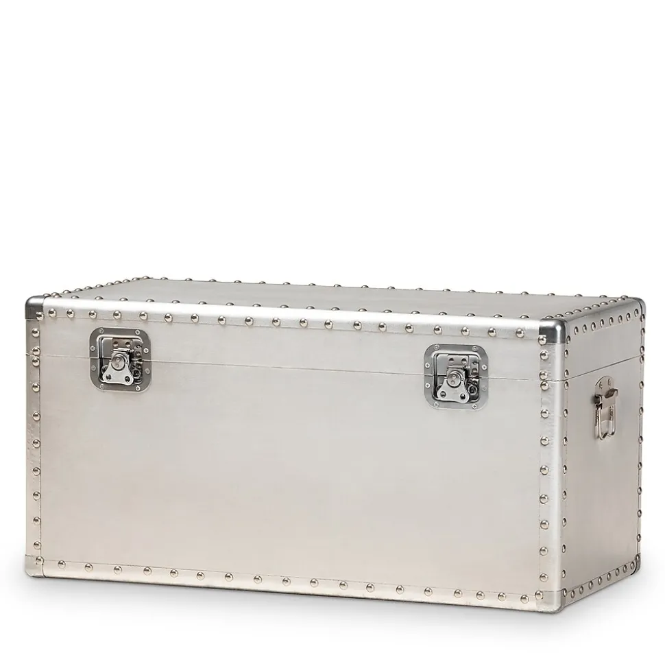 Add cool, vintage industrial-inspired storage to your space with the Serge trunk. Constructed from metal, the Serge features a spacious inner storage compartment. Modeled after antique steamer trunks, the Romain is accented with silver metal handles and imitation locks. Rivets add an extra dose of industrial style. Use the Serge to store extra blankets, pillows, and more. The Serge trunk is made in China and will arrive fully assembled.