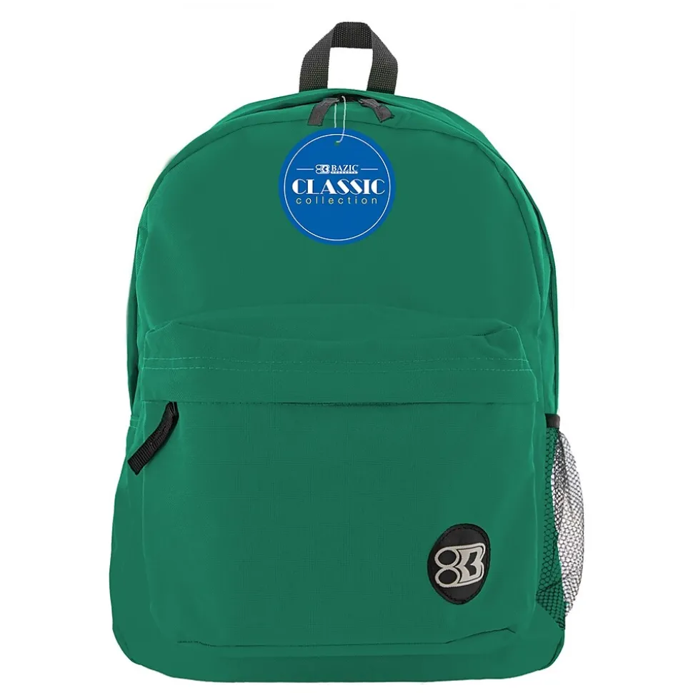This 17″ school bag features 2 compartments and a bottle pocket: one large compartment mainly for larger items such as text book, binders, and laptops, the other compartment is a smaller compartment located in front, mainly for smaller items, such as cell phones, keys, and hand sanitizer. Both compartments have zipper closure. The bottle holder is on one side of the backpack. There are 2 adjustable shoulder straps nicely padded for comfort when carrying the backpack. There are 2 zipper pulls for the large compartment, and 1 zipper pull for the smaller compartment. There is a nylon handle on top of the backpack, convenient for hanging the backpack on hook outside of classrooms, or any hanger. Bazic Products’ logo is stitched in the front, on the bottom right of the small compartment for recognition. Sold as a pack of 2 backpacks.