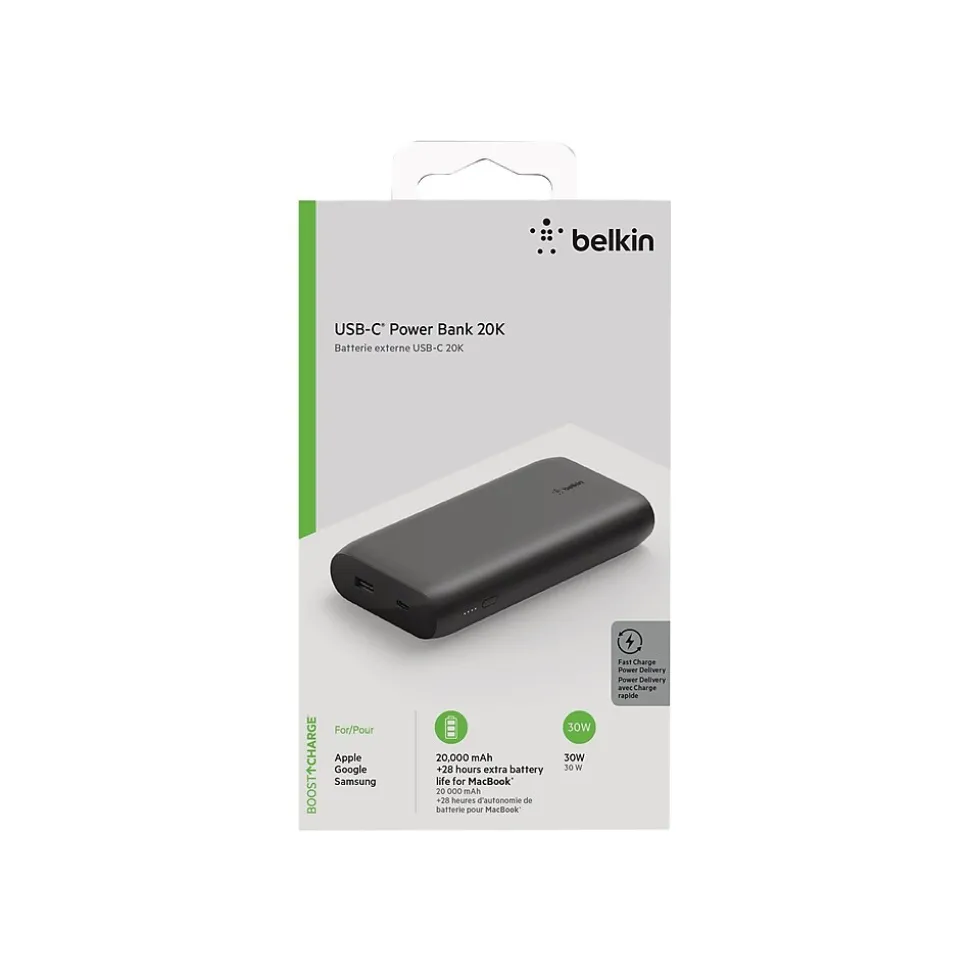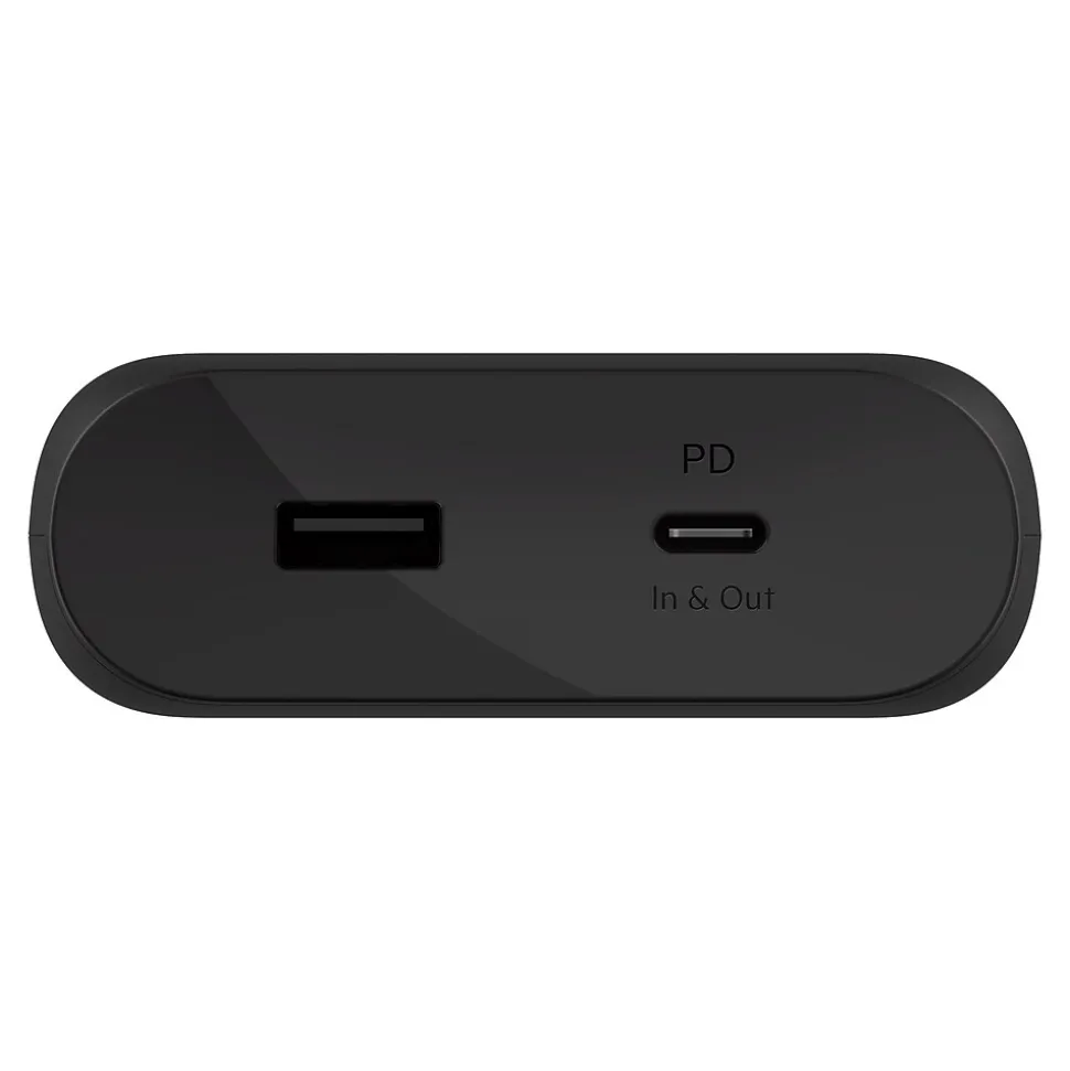 Our USB-C® Power Bank 20K has 20,000 mAh to provide up to an additional 9 hours* of battery life to your MacBook, up to 28 hours* to your iPad or up to 77 hours* to your phone. Powerful enough to fully charge a USB-C laptop, it ensures your productivity remains uninterrupted. Convenient USB-A and USB-C ports keep devices charged without plugging into a wall outlet, so you can video conference for work or stream movies on long flights.