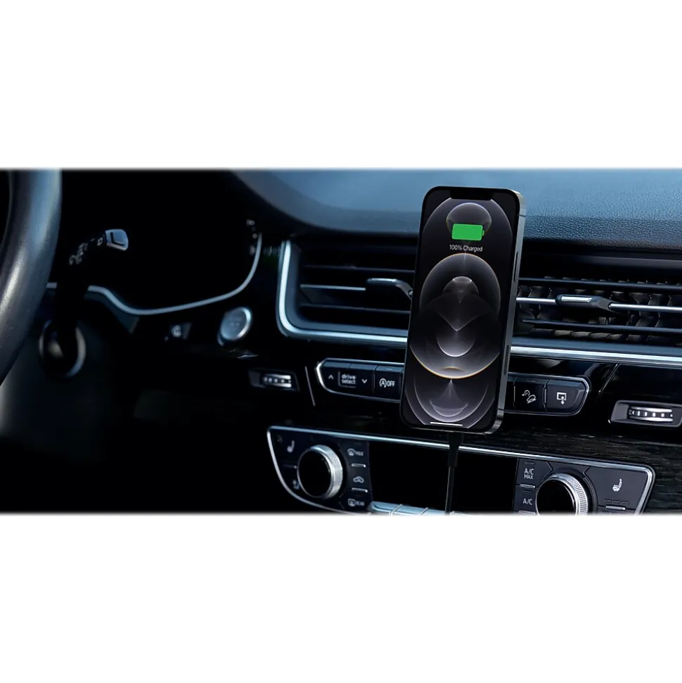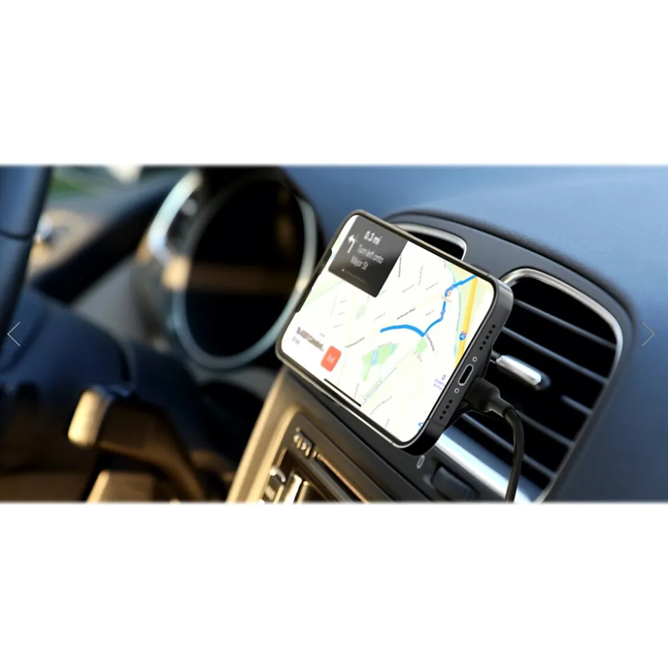 This Belkin BOOST CHARGE wireless car charger is designed to leverage the MagSafe technology in your devices. Quickly charge your device in the car with more power, so you’ll always arrive with a charge. Mounting your phone is easy with the convenience of one-handed placement and perfect magnetic alignment every time. View your screen in portrait mode to set the playlist, and flip to landscape mode for GPS, all without interrupting your charge.