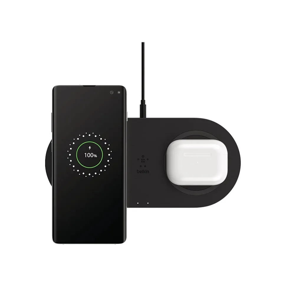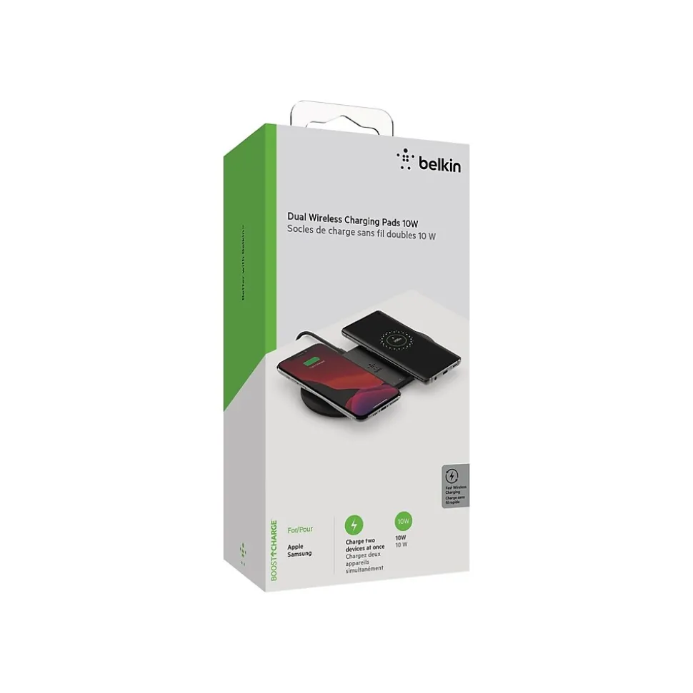 Prevent a bottleneck at your charging pad by doubling down. Take advantage of all the benefits of the industry-leading wireless charging technology, plus the convenience of charging two devices simultaneously. BOOST↑CHARGE Dual Wireless Charging Pads free up counter or desk space and are compatible with both iOS and Android, making them perfect for coworkers or families that use different devices. The non-slip grip design keeps your devices securely in place to ensure they keep charging, and LED lights indicate when they’re charging correctly. Designed for seamless compatibility with the newest smartphones from Apple and Samsung, each of the Dual Wireless Charging Pads delivers up to 10W of power for a faster charge across the board. Charge without removing your phone from its case. The BOOST↑CHARGE Dual Wireless Charging Pads are engineered to work with most lightweight plastic cases up to 3mm (not compatible with metal cases).