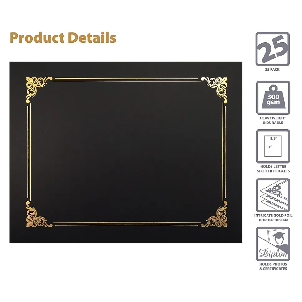 The Better Office certificate holder is designed to hold an 8.5″ x 11″ award certificate, diploma, or document. This heavyweight certificate holder is made of 300 gsm paper with gold-tone foil scroll design to accent its cover. It measures 8.75″ x 11.25″ folded, with reinforced interior edges and die-cut slots in four corners for a secure hold. A total of 25 certificate holders are included in the pack.