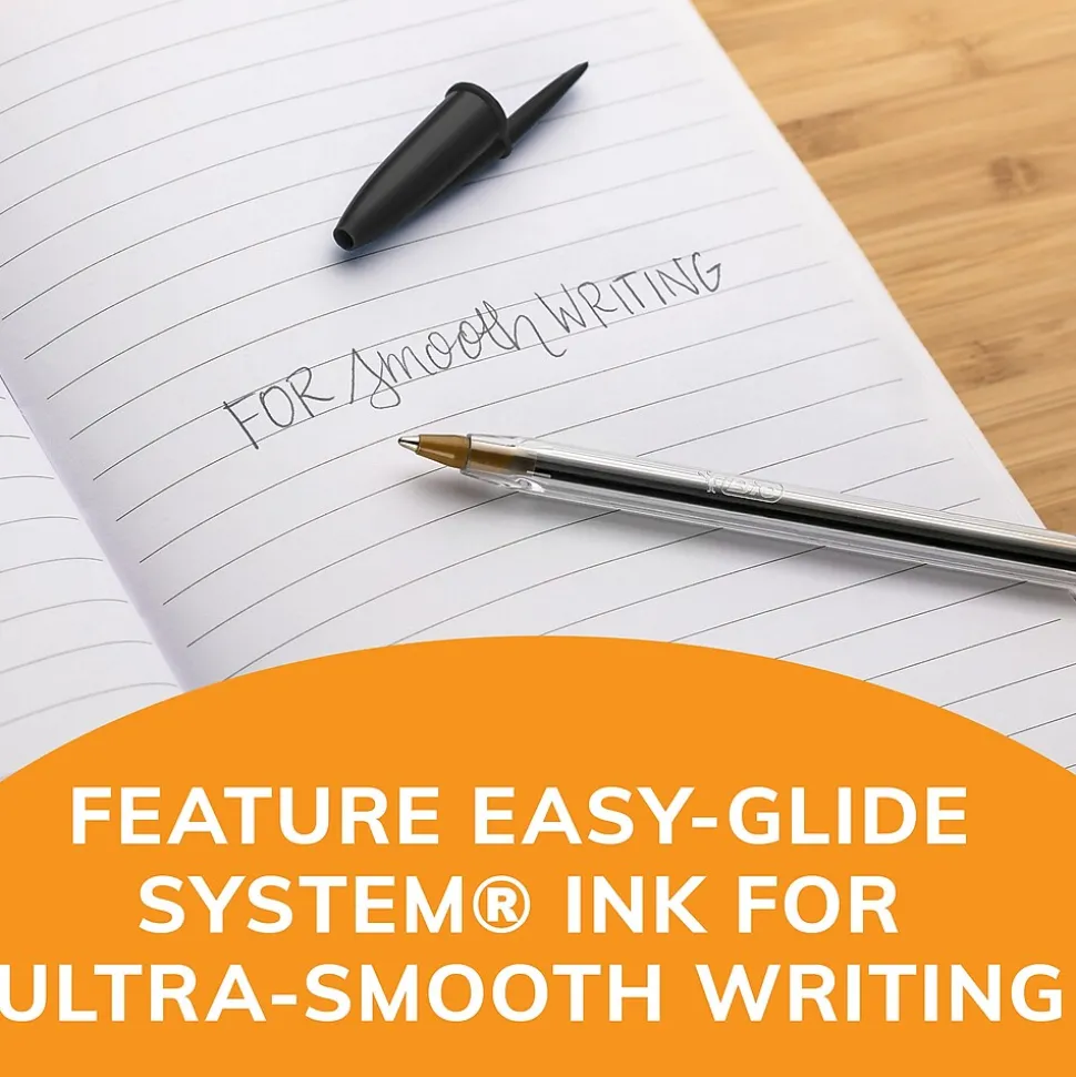 Combine exceptional performance and longevity with the BIC Cristal Xtra Smooth black ballpoint pen. The flexible 1.0 mm medium-point pen delivers crisp, legible lines, making this pen a superb choice for everyday writing activities. The pen minimizes blotting and skipping as the tungsten carbide ball helps the black ink spread evenly. The BIC Cristal Xtra Smooth pen has a snug, comfortable grip and a translucent hexagonal barrel that lets you see how much ink remains. The matching cap includes a handy clip for easy attachment to pockets or notebooks.