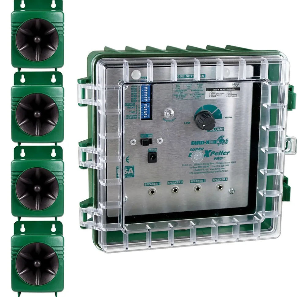 Keep birds away with the Super Bird-X Peller Pro Sonic Deterrent which broadcasts pre-recorded bird alarm calls and predator cries. This unit helps control birds outdoors with its sophisticated sonic technology. The Super Bird-X Peller is fully-programmable. You control the volume, how often it goes off and when it goes off. This unit is used to deter pigeons, starlings, sparrows, and seagulls and it can cover up to 6 acres.