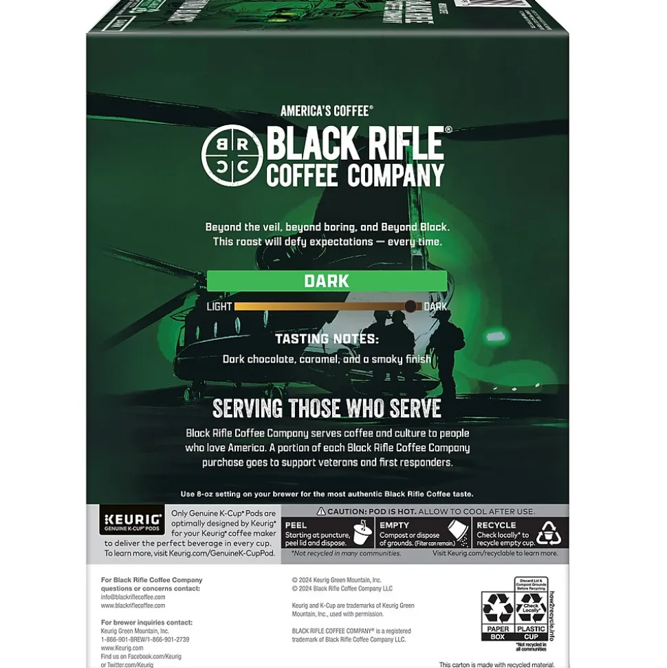 Beyond Black is a fine dark roast that is best enjoyed stealthily. Packed with powerful spicy aromas, notes of dark chocolate, and an alluring smoky finish, every Beyond Black K-Cup pod brews coffee tailor-made for dark roast enthusiasts. It’s not easy finding the perfect beans to represent Black Rifle Coffee Company. We have scoured through the coffee powerhouses of the world to find high-quality coffee beans to deliver a full-flavored taste no matter how you take your coffee. So every one of our Beyond Black K-Cup pods gives you the perfect cup, every cup. Black Rifle Coffee Company serves coffee and culture to people who love America. We develop our explosive roast profiles with the same mission focus we learned as military members serving this great country, and we are committed to supporting veterans, law enforcement, and first responders. Each Beyond Black K-Cup pod is filled with freshly ground coffee beans and is compatible with all Keurig single serve coffee makers. Simple. Delicious. And recyclable. Enjoy the same great-tasting coffee you know and love, and when you’re done, just peel, empty, and recycle. Check locally, not recycled in many communities.